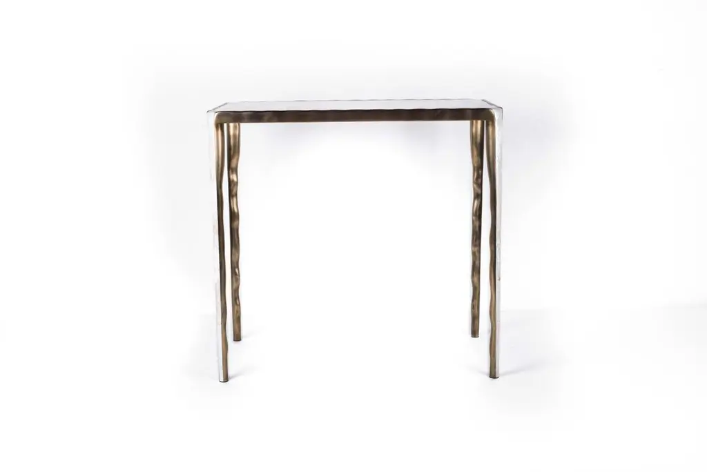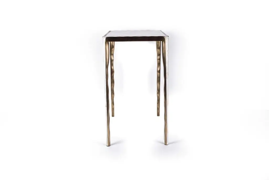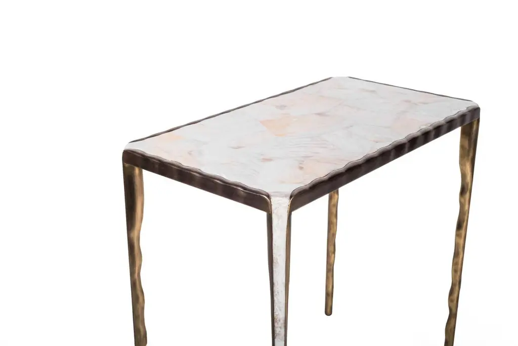 The Paris based label has distinguished themselves since their launch, with their iconic use of shagreen mixed with brass and other exotic materials. All furniture is handcrafted by skilled artisans, ultimately making each piece unique, designed in Paris and produced in the Philippines.The Melting Nesting Side Table in Large is part of a series of nesting side tables (sold separately) . One can purchase the tables on their own or buy them as a set to create elegant & geometric shapes. This piece is inlaid in mother of pearl and the top is framed with an irregular surface bronze-patina brass that continues onto the legs, which creates the "melting" effect against the shell inlay. This piece comes in 3 sizes total (L, M & S), image at end of slide. The mother of pearl is hand selected by artisans before being inlaid, creating a one of a kind piece every time. This piece can also be ordered in other finishes, image at end of slide. The dimensions of this piece are 63 x 35 x 60 cm / 24.75 x 13.75 x 23.75"All R&Y Augousti pieces are handmade by artisans, ultimately making each piece unique. Custom color/sizing available on request. Wipe clean with soft dry cloth.Acclaimed design duo Ria & Yiouri Augousti have established themselves since the 1990s as pioneers of modern-vintage style through their luxurious Art Deco inspired collections.The Paris based label has distinguished themselves since their launch, with their iconic use of shagreen mixed with brass and other exotic materials. All furniture is handcrafted by skilled artisans, ultimately making each piece unique. All shagreen-covered items should be kept out of direct sunlight, color variants may occur on the stingray and other exotic finishes, but this showcases the Parisian label's commitment to creating authentic luxurious products using natural components.