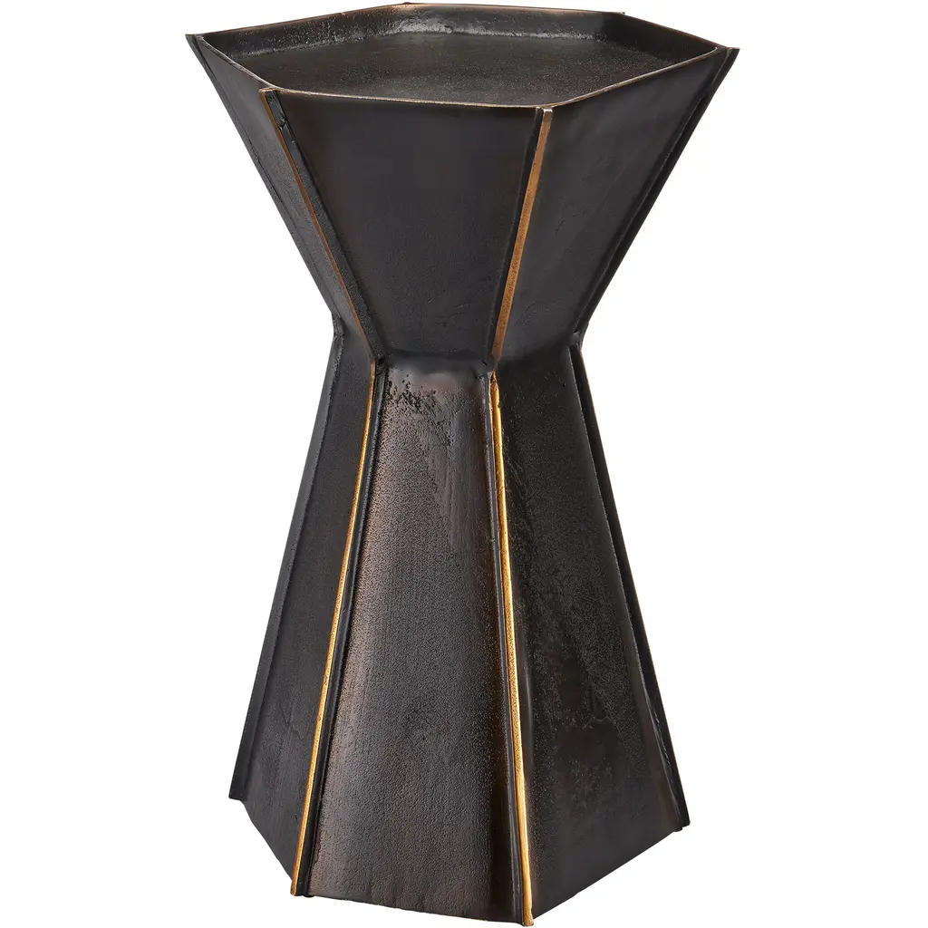 The Merola Accent Table has a unique shape and surface pitting that illustrates the strength and beauty of cast aluminum creations. The larger surfaces, finished in bronze, are intersected by thin raised surfaces in gold. The modern accent table with its fluted shape is truly an artisanal piece.