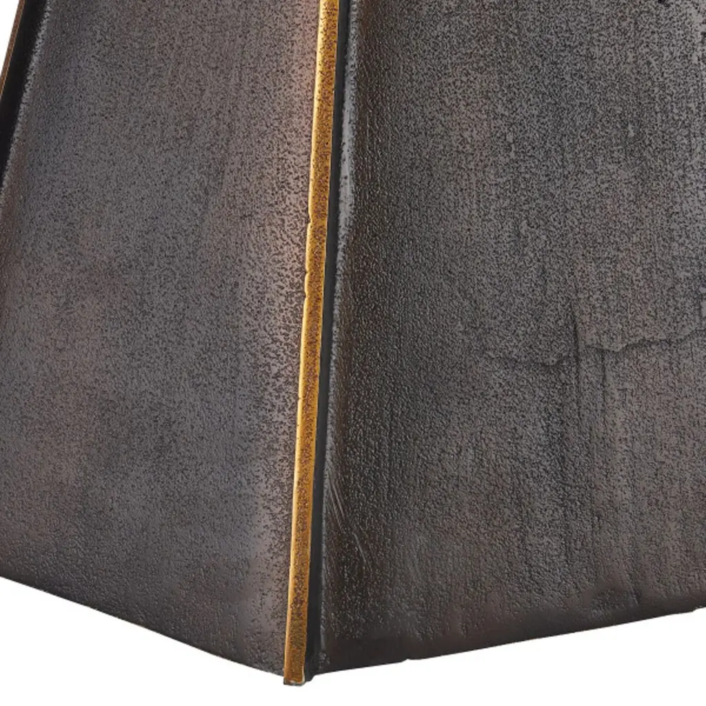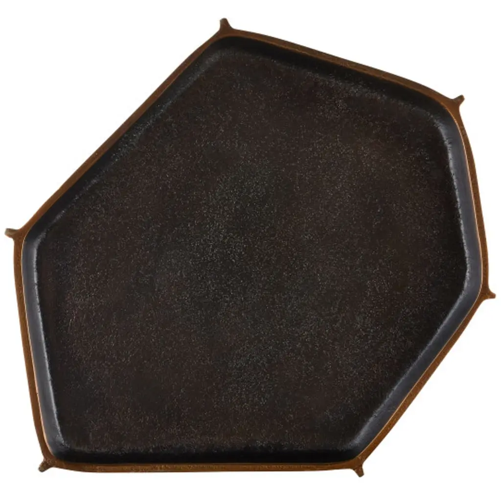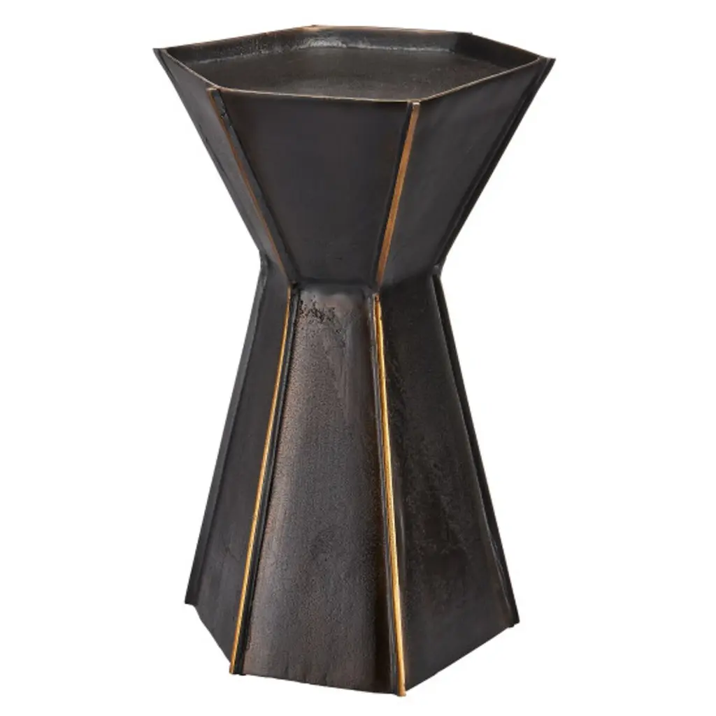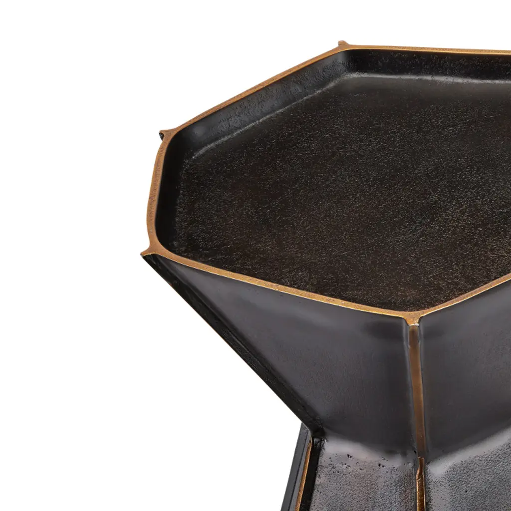 The Merola Accent Table showcases a unique shape and surface pitting that highlights the strength and beauty of cast aluminum creations. Its larger surfaces are intersected by thin raised surfaces, creating a striking contrast. This modern accent table, with its fluted shape, is truly an artisanal piece.