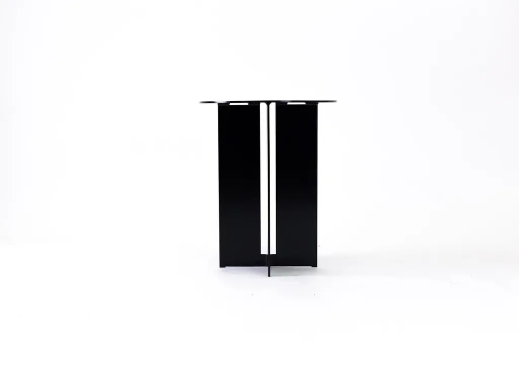 The Mers Side Table is fabricated from solid aluminum and is suitable for use indoors and out. Form is inspired by the simple utilitarianism of West Coast aluminum fishing boats.Shown in aluminum with Black painted finish.Custom sizing and colors available.Overall dimensions: 18" D x 22" HAll New Format pieces are handmade in Vancouver, Canada.