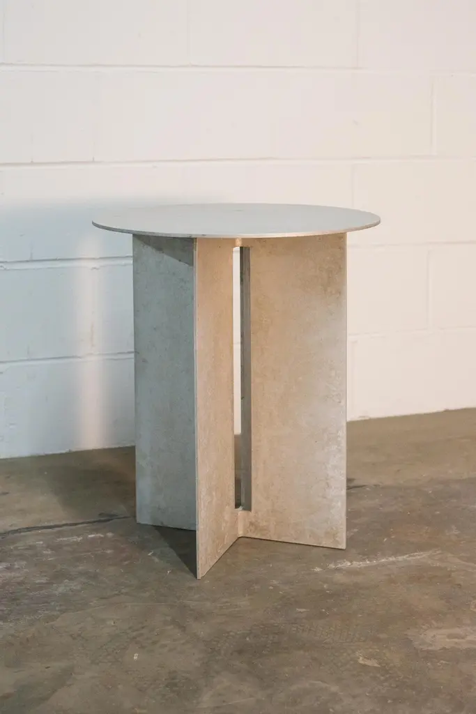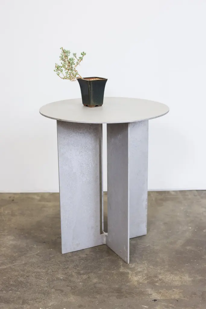 The Mers side table is fabricated from solid aluminum, and patinated with our in-house salt pack technique. It is suitable for use indoors and out. Finish and form are both inspired by the unpretentious utilitarianism of West Coast aluminum fishing boats.Shown in aluminum with salt pack finish.Overall dimensions: 19" D x 22" TAll new format pieces are handmade in Vancouver, Canada.