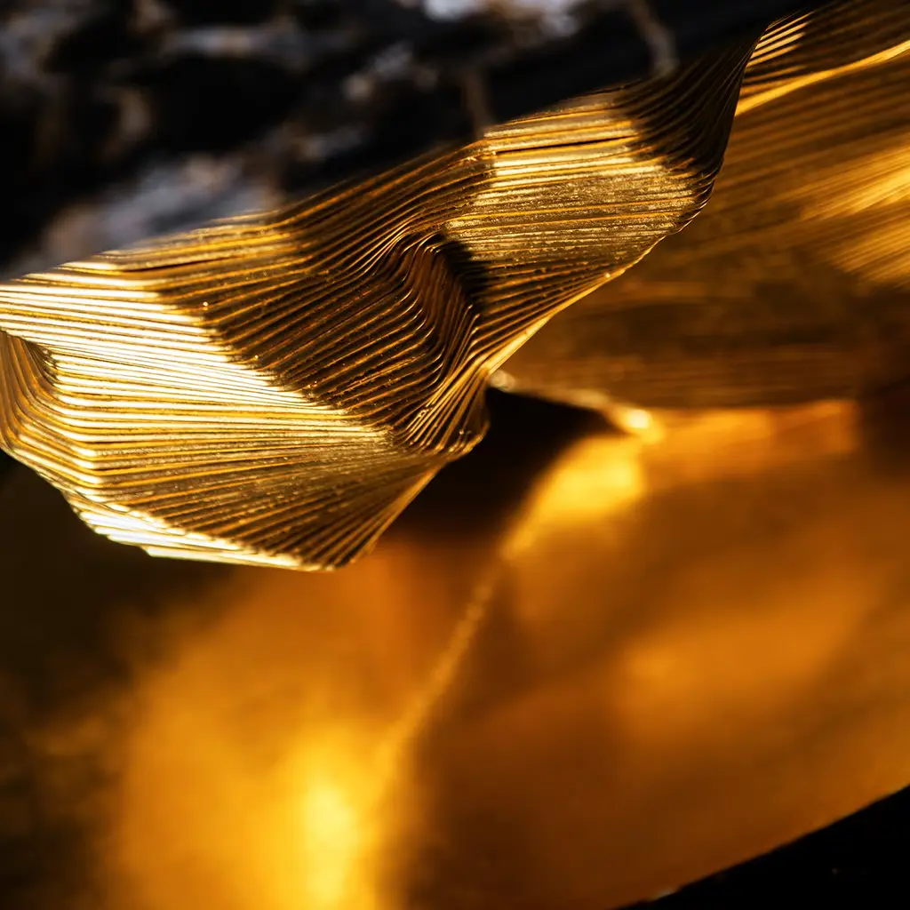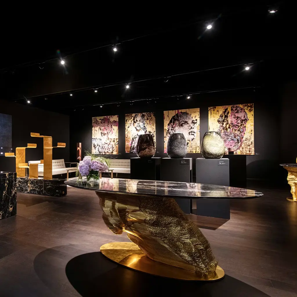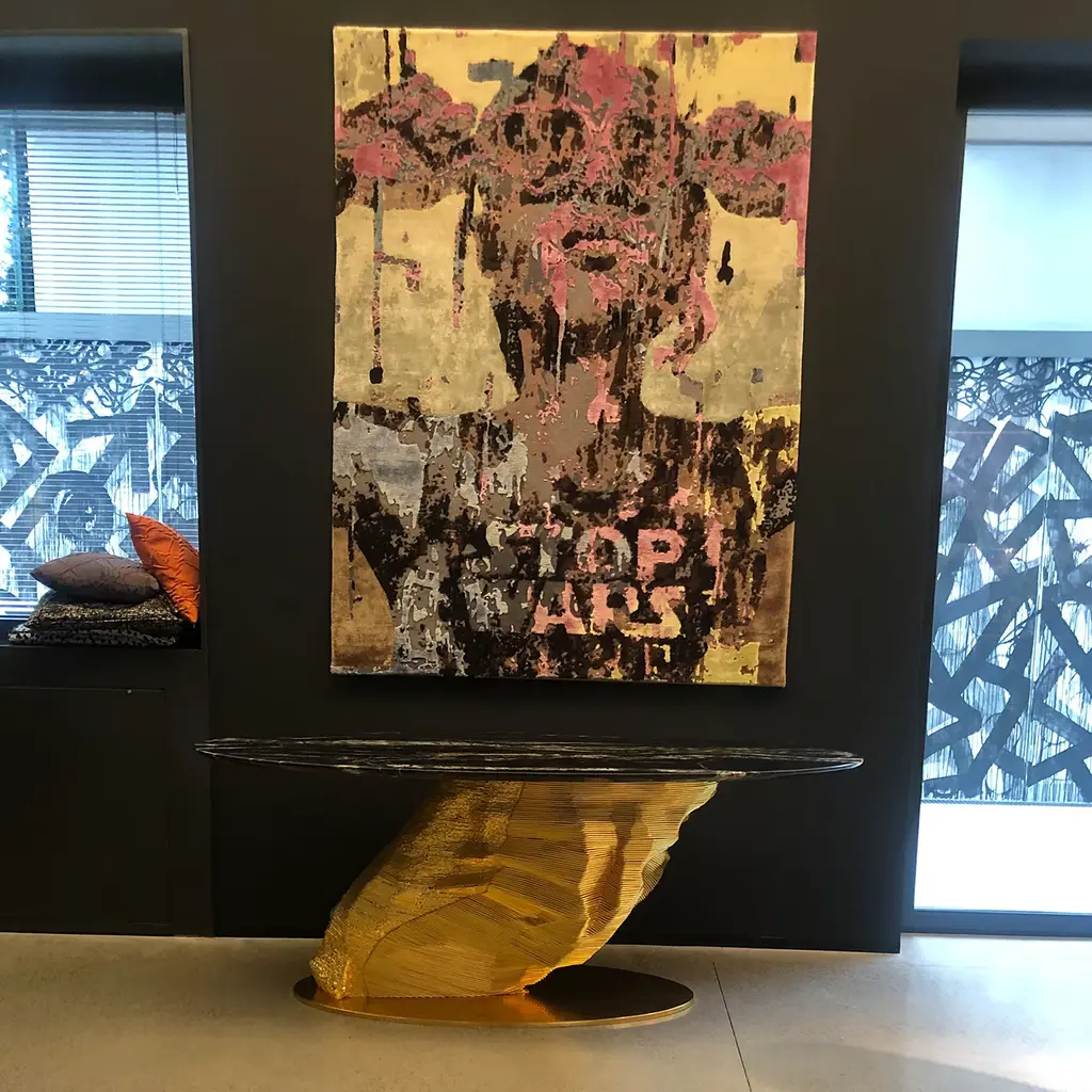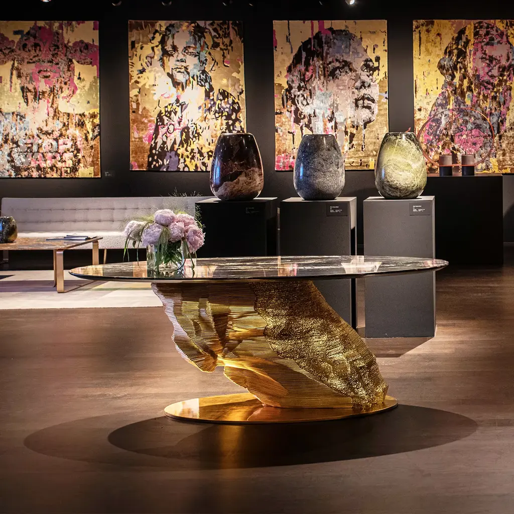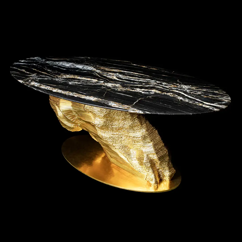 An opulent, standout design for a refined interior of traditional or contemporary inspiration, this extraordinary table by Giò Pozzi features a precious Belvedere marble top resting on a striking, handcrafted, and sculpted base in steel, covered with pure 24k gold leaf. It boasts warm and soothing shades of captivating character and is part of a numbered series of customizable designs by Officina Della Scala. Unique steel processing technique: bent, hand-welded and polished. Please ask the Concierge for customization options.