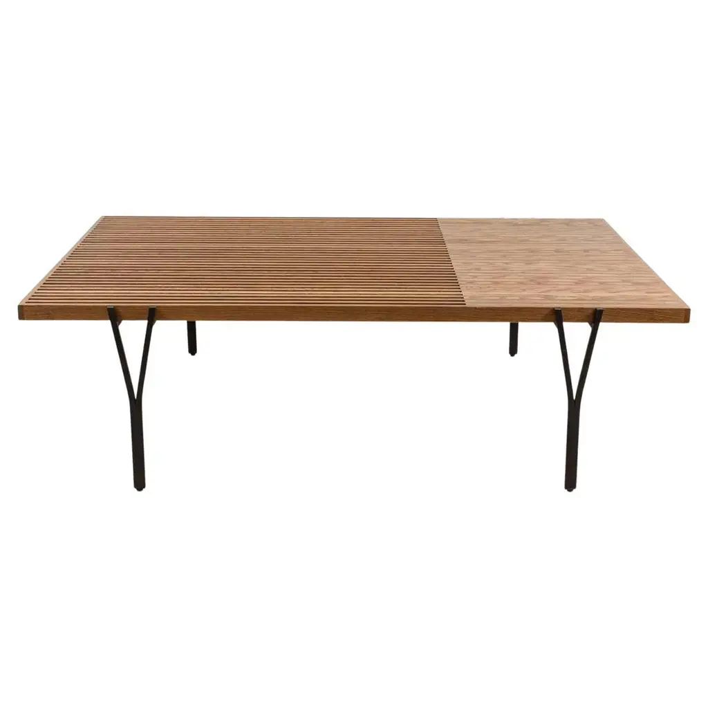 MEX HI OUTDOOR is a low iroko garden side table.MaterialsTubular AISI 304 stainless steel base outdoor powder-coated in taupe, ivory, green, terracotta;Low table top in solid natural Iroko wood slats or ivory glazed porcelain stoneware,Low table mattress in polyurethane covered with recycled PET fibre wadding coupled with water-repellent canvas.The ample forms and essential lines of Mex-Hi, the modular sofa system designed by Piero Lissoni, blend with new materials and finishes in a new collection studied specifically for outdoor use. Thanks to three different sized bases that can be combined to create versatile and dynamic compositions. The system is enriched with a larger three-seater sofa that can be used as an independent element, together with a cosy daybed to laze around and sunbathe by the pool. A solid Iroko wood top can be added onto the frame’s base to form a functional integrated coffee table, creating a harmonious interplay of textures. This wood essence immediately gives the system a warmer feel for a welcoming and relaxing ambience. To complete the Mex-Hi Outdoor system, three free-standing side tables, with the same metal frame, are also available with a solid Iroko wood slatted top or in ivory glazed porcelain stoneware. It is also possible to place a mattress on top of each table to transform it into a comfortable seat, further emphasising its functionality. The cosy padded seat of the Mex-Hi Outdoor, made of recycled PET fibre wadding and polyurethane with a percentage of polyols derived from biological sources, is protected by a water-repellent canvas to prevent water from permeating inside. The upholstery’s new textured weaves wrap around the system’s shapes while a selection of evocative colours recall Mediterranean landscapes. Made for outdoor use, the sophisticated metal structure that holds the soft upholstered elements is presented in four new shades: taupe, ivory, green and terracotta. The cushions have also been usefully developed to be easily removed from the structure for maintenance or washing.
