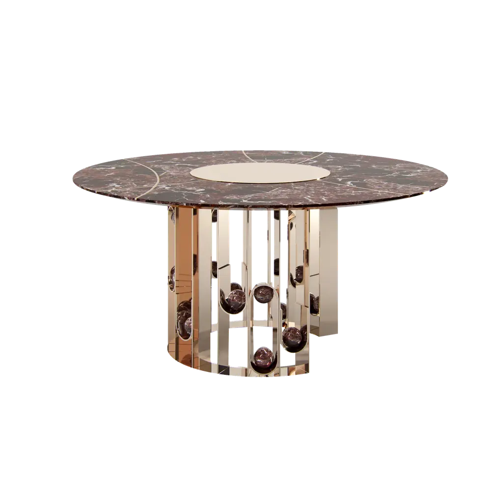 Meyer table by Royal StrangerDimensions: D 160 x W 160 x H 75 cm.Materials: Carrara marble with polished finish, lilac lacquered with glossy finish base, brushed brass ring.Available in:Table Top: Carrara Marble, Nero Marquina, Estremoz, Rose Estremoz, Guatemala Green and Emperador with polished or honed finish.Base: in walnut or Sottsass wood veneers, in red, orange or grey colors, or lacquered in all NCS/RAL colors, or in gold, copper and silver leaf, with glossy or matte finish.Ring: Available in brass, stainless steel and copper with polished or brushed finish, or lacquered in all NCS/RAL colors with matte or glossy finish.Meyer Table takes inspiration from Oscar Niemeyer's notable work. Inheriting from its sinuous shapes and horizontal lines, it conveys a swell, stable aesthetic.Its rounded tabletop brings a mature presence to the room. It rests on a set of three coordinated curved legs that connect it to the ground, while being encircled by a metallic rim.That latter, adorned with small sphre-shaped details, adds a visual sense of stability to the design, while borrowing from its rounded shapes.Meyer Table's eloquent discourse flows from architecture to furniture scale.Royal stranger is an exclusive furniture brand determined to bring you the best unique pieces of art and design.Fusing design, art and the best craftsmanship, they strive to deliver the best state of the handmade art furniture. The design team works every day to create meaningful products that represent values such as passion, function, aesthetics and know-how. Values that are meant to represent Royal stranger’s DNA. This dedication is present at all stages of production and the combination of craftsmanship and innovative design contributes to our final purpose: to produce certified high-quality products, made with passion and expertise and using royal materials such as gold leaf, rich woods and high quality lacquers.It was in 2013, as an architects, that Sofia Santos & Rui Santos started to push the boundaries of innovation in several retail design concepts for some of the best stores in Portugal. This will has always been present in their work, and that’s how the brand was born.