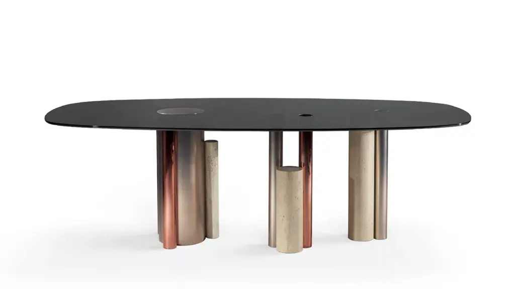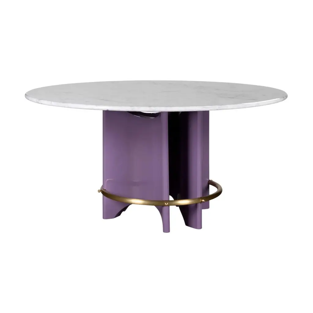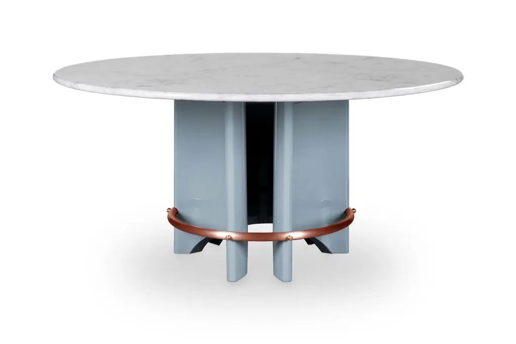 Meyer table by Royal StrangerDimensions: D 160 x W 160 x H 75 cm.Materials: Carrara marble with polished finish, lacquered with glossy finish base, copper ring.Available in:Table Top: Carrara Marble, Nero Marquina, Estremoz, Rose Estremoz, Guatemala Green and Emperador with polished or honed finish.Base: in walnut or Sottsass wood veneers, in red, orange or grey colors, or lacquered in all NCS/RAL colors, or in gold, copper and silver leaf, with glossy or matte finish.Ring: Available in brass, stainless steel and copper with polished or brushed finish, or lacquered in all NCS/RAL colors with matte or glossy finish.Meyer Table takes inspiration from Oscar Niemeyer's notable work. Inheriting from its sinuous shapes and horizontal lines, it conveys a swell, stable aesthetic.Its rounded tabletop brings a mature presence to the room. It rests on a set of three coordinated curved legs that connect it to the ground, while being encircled by a metallic rim.That latter, adorned with small sphre-shaped details, adds a visual sense of stability to the design, while borrowing from its rounded shapes.Meyer Table's eloquent discourse flows from architecture to furniture scale.Royal stranger is an exclusive furniture brand determined to bring you the best unique pieces of art and design.Fusing design, art and the best craftsmanship, they strive to deliver the best state of the handmade art furniture. The design team works every day to create meaningful products that represent values such as passion, function, aesthetics and know-how. Values that are meant to represent Royal stranger’s DNA. This dedication is present at all stages of production and the combination of craftsmanship and innovative design contributes to our final purpose: to produce certified high-quality products, made with passion and expertise and using royal materials such as gold leaf, rich woods and high quality lacquers.It was in 2013, as an architects, that Sofia Santos & Rui Santos started to push the boundaries of innovation in several retail design concepts for some of the best stores in Portugal. This will has always been present in their work, and that’s how the brand was born.