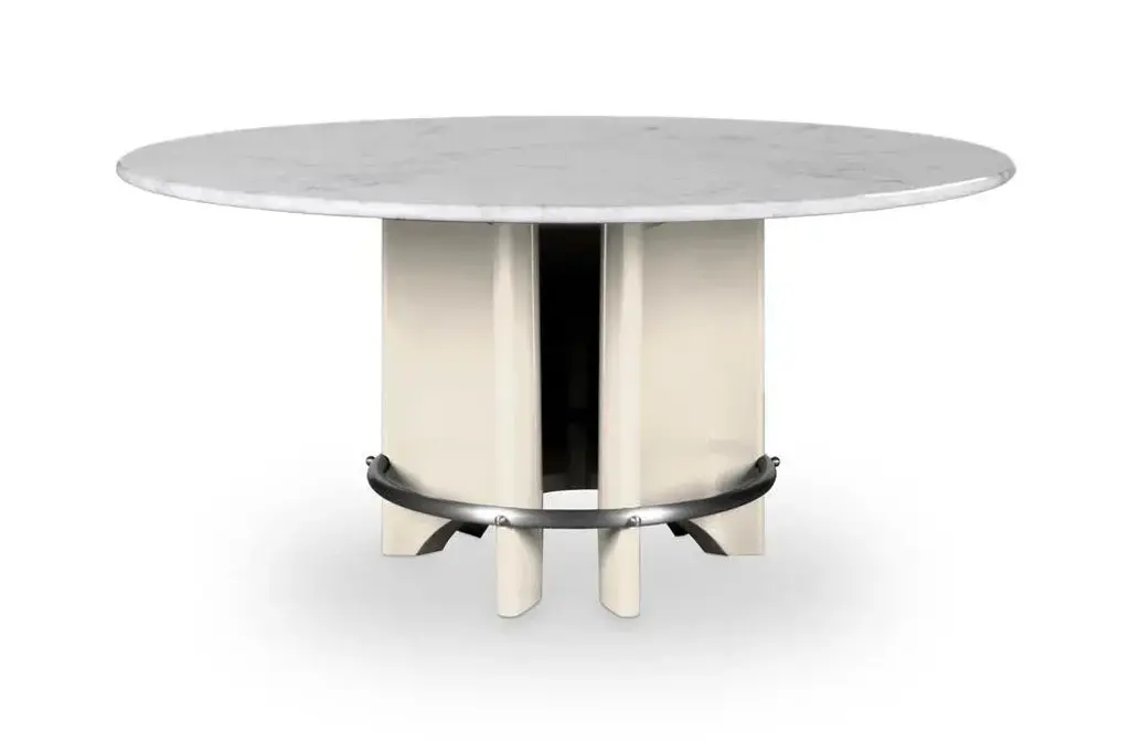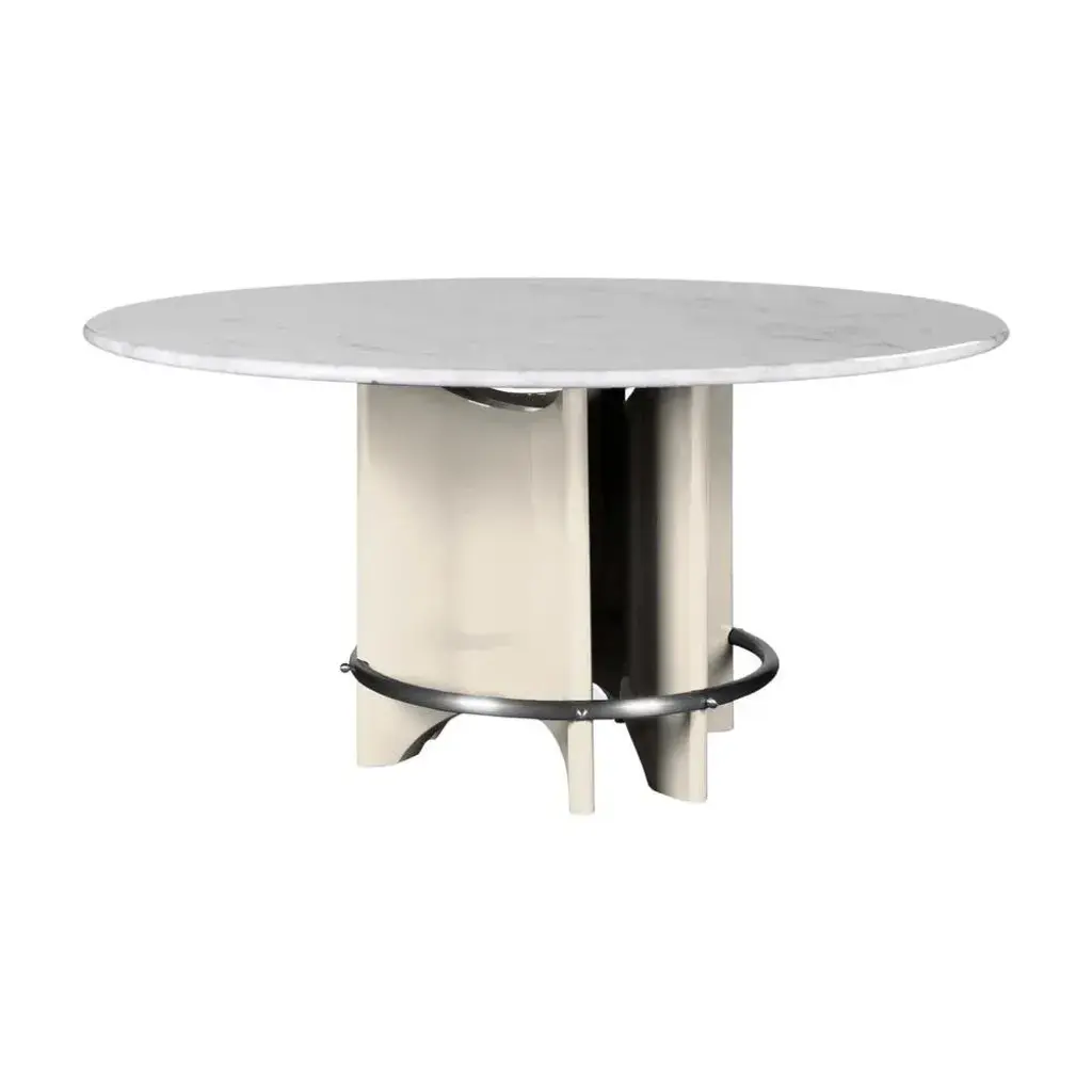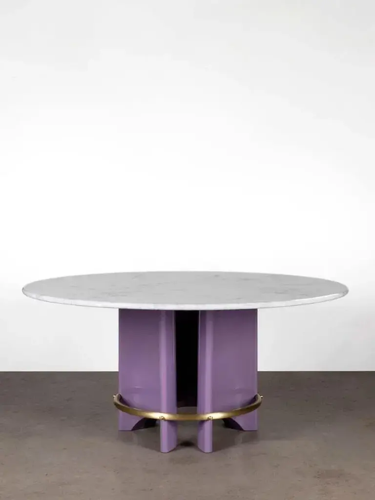 Meyer table by royal stranger dimensions: d 160 x w 160 x h 75 cm. Materials: carrara marble with polished finish, lacquered with glossy finish base, stainless steel ring. Available in: table top: carrara marble, nero marquina, estremoz, rose estremoz, guatemala green and emperador with polished or honed finish. Base: in walnut or sottsass wood veneers, in red, orange or grey colors, or lacquered in all ncs/ral colors, or in gold, copper and silver leaf, with glossy or matte finish. Ring: available in brass, stainless steel and copper with polished or brushed finish, or lacquered in all ncs/ral colors with matte or glossy finish. Meyer table takes inspiration from oscar niemeyer's notable work. Inheriting from its sinuous shapes and horizontal lines, it conveys a swell, stable aesthetic. Its rounded tabletop brings a mature presence to the room. It rests on a set of three coordinated curved legs that connect it to the ground, while being encircled by a metallic rim. That latter, adorned with small sphre-shaped details, adds a visual sense of stability to the design, while borrowing from its rounded shapes. Meyer table's eloquent discourse flows from architecture to furniture scale. Royal stranger is an exclusive furniture brand determined to bring you the best unique pieces of art and design. Fusing design, art and the best craftsmanship, they strive to deliver the best state of the handmade art furniture. The design team works every day to create meaningful products that represent values such as passion, function, aesthetics and know-how. Values that are meant to represent royal stranger’s dna. This dedication is present at all stages of production and the combination of craftsmanship and innovative design contributes to our final purpose: to produce certified high-quality products, made with passion and expertise and using royal materials such as gold leaf, rich woods and high quality lacquers. It was in 2013, as an architects, that sofia santos & rui santos started to push the boundaries of innovation in several retail design concepts for some of the best stores in portugal. This will has always been present in their work, and that’s how the brand was born. This piece is attributed to the mentioned designer/maker. It has no attribution mark and no official proof of authenticity, however it is well documented in design history. I take full responsibility for any authenticity issues arising from misattribution