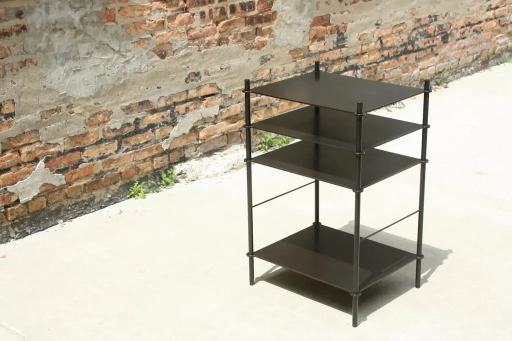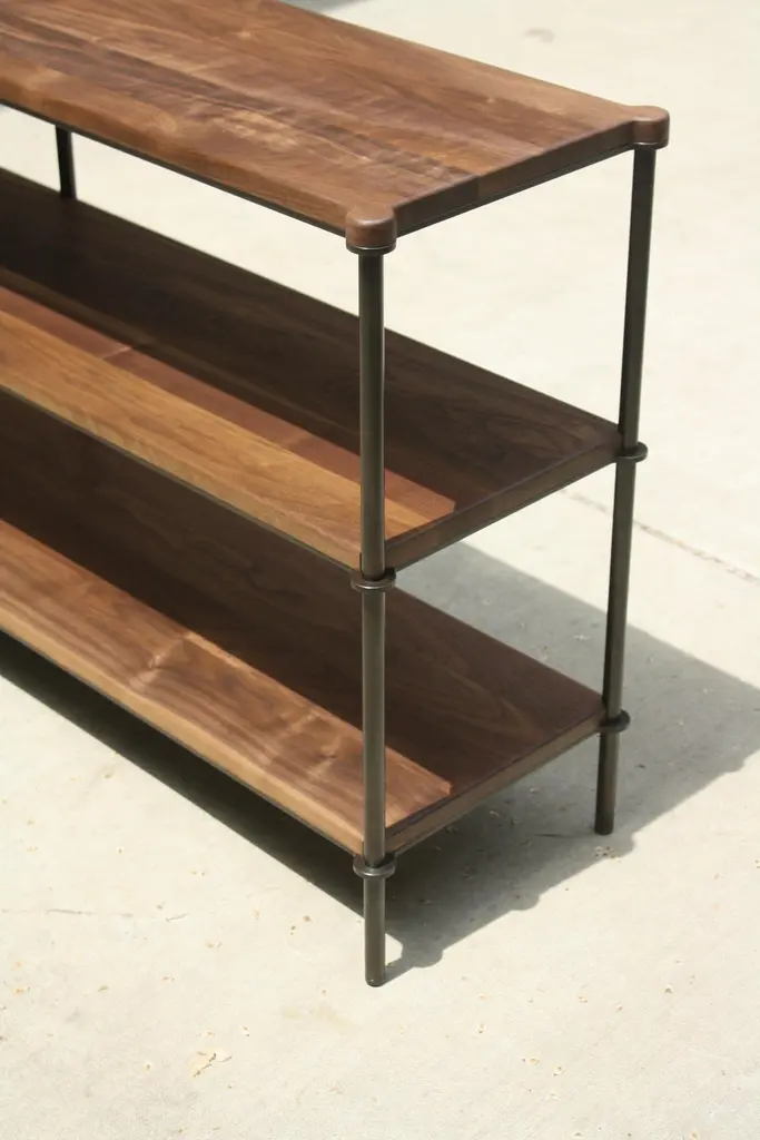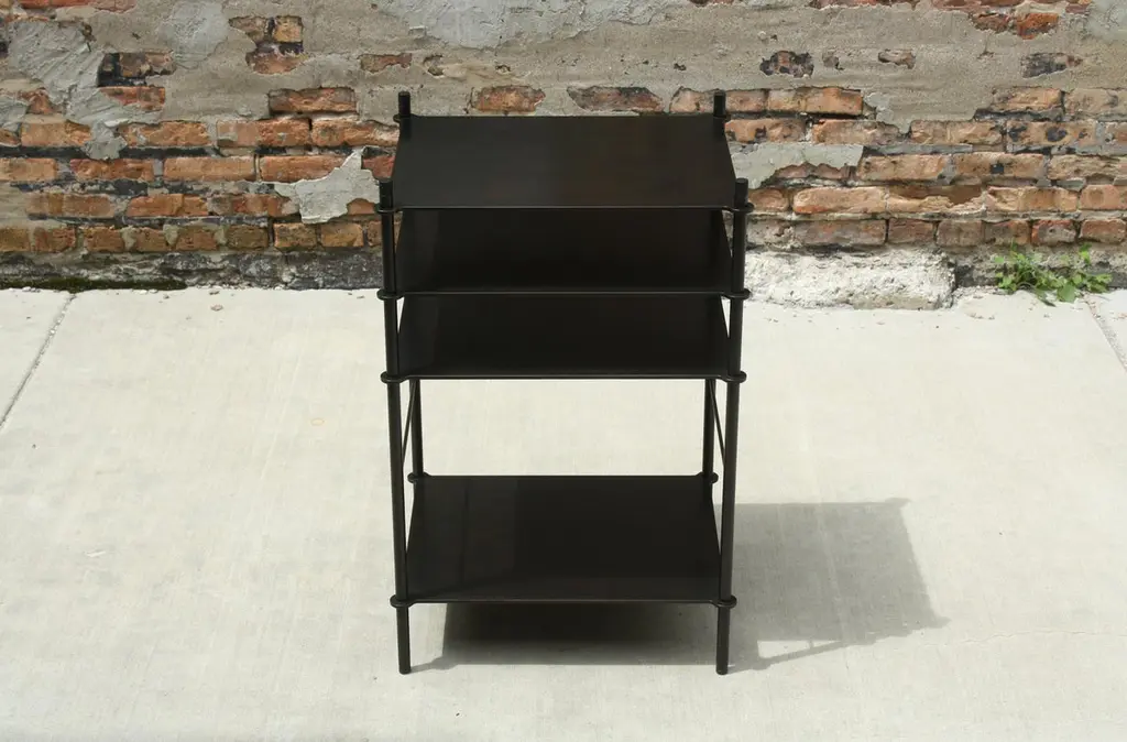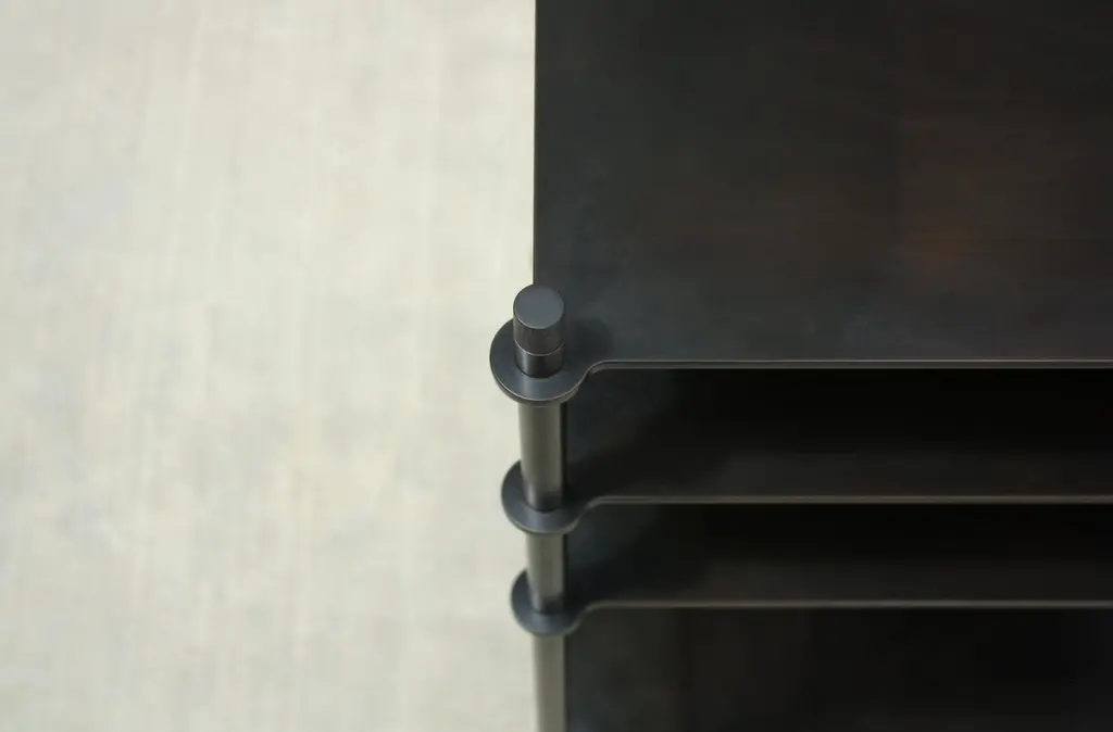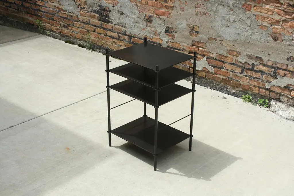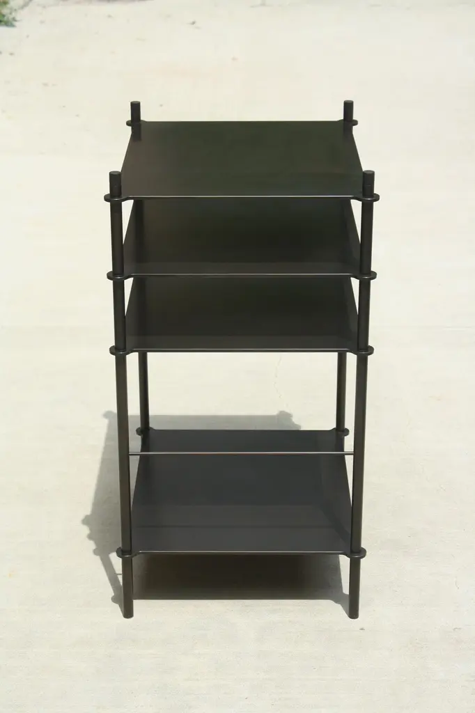 Tiered surfaces are precision welded to leveling legs creating an open shelving system that can be customized for any space or use. Shown in acid blackened steel with hand-turned and ebonized walnut finials, the piece shown was designed to hold a turntable and receiver with space for records below.Available in custom dimensions and finishes. Can be configured to include more or less surfaces, drawers and/or doors.