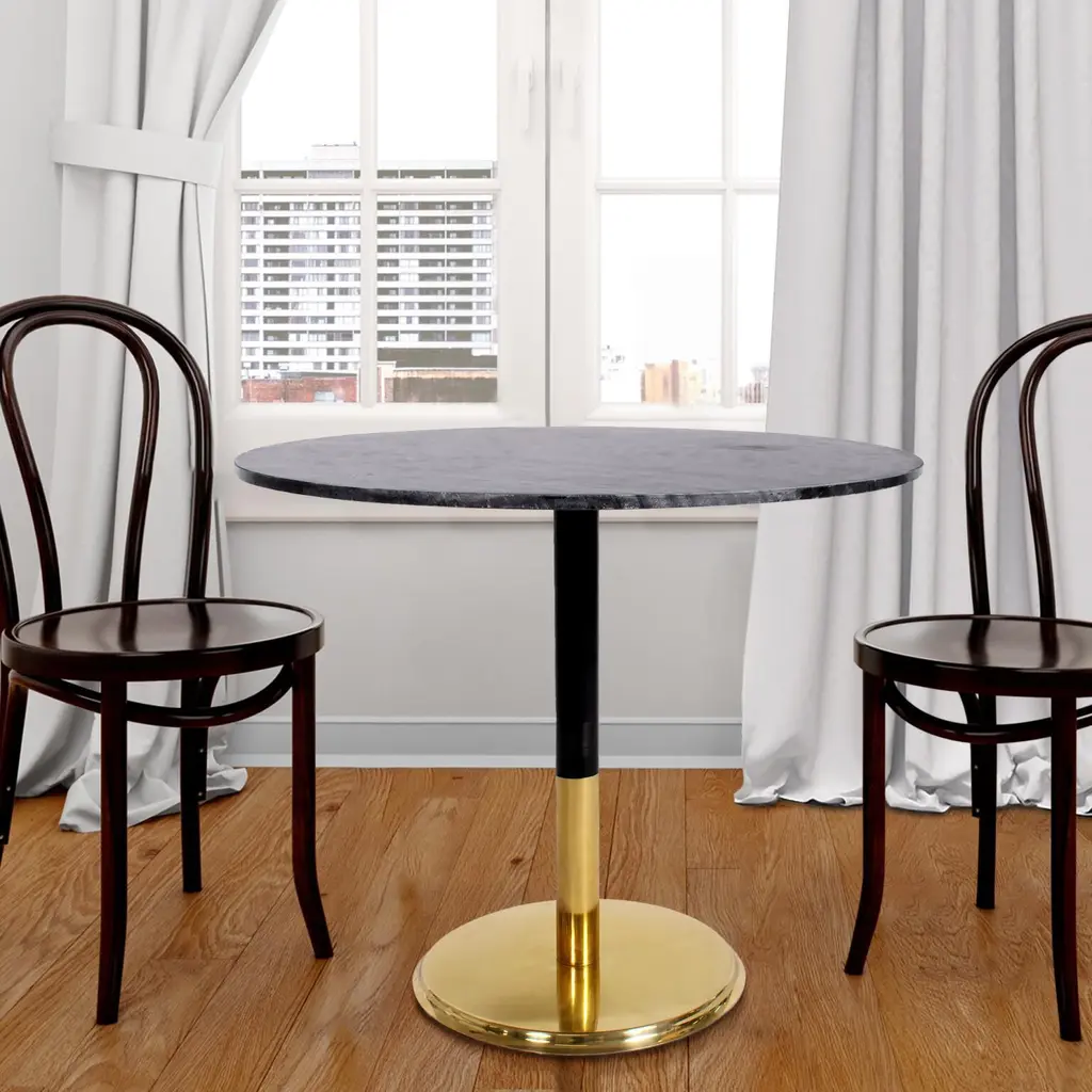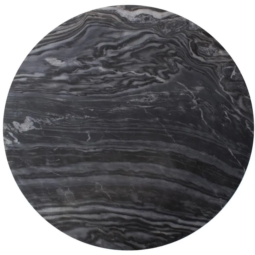 The table boasts a luxurious marble top, featuring deep onyx tones with intricate swirls of grays and whites, artfully mimicking the intricate wood grain patterns and the ebb and flow of the sea's waves. This mesmerizing marble surface transforms every meal into an experience of elegance and wonder. Resting upon a sleek black and polished gold base, the table juxtaposes the natural warmth of its top with a touch of modern minimalism, creating a harmonious balance that enhances any dining space.
