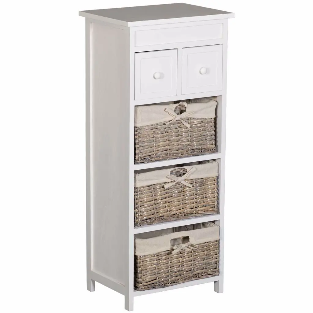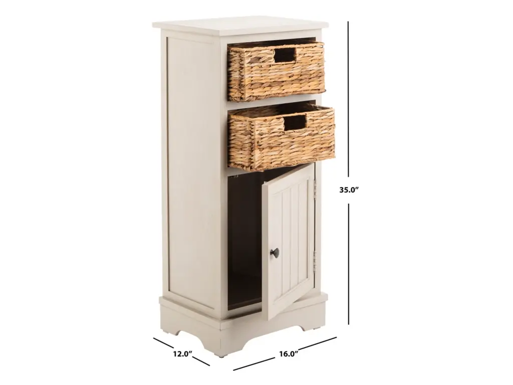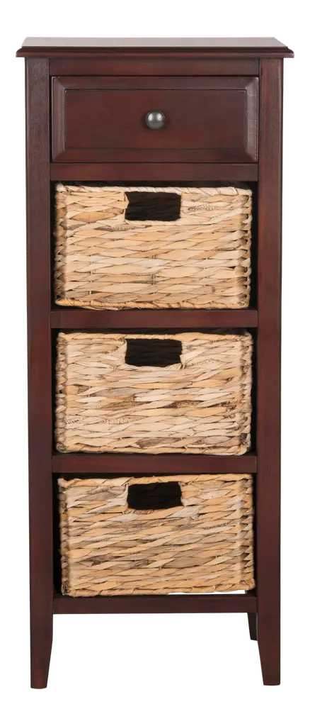 Exuding quiet countryside charm, this cabinet is crafted of pine with a beautiful finish, three sliding bins made of hearty rattan, and a sliding drawer with bronze-finished hardware.