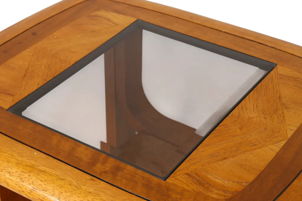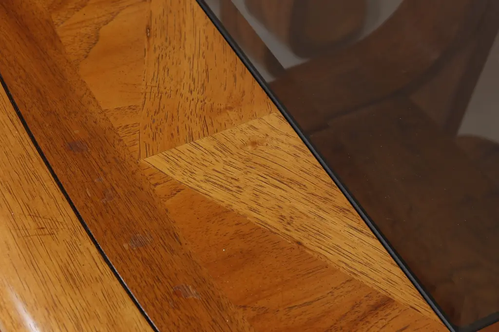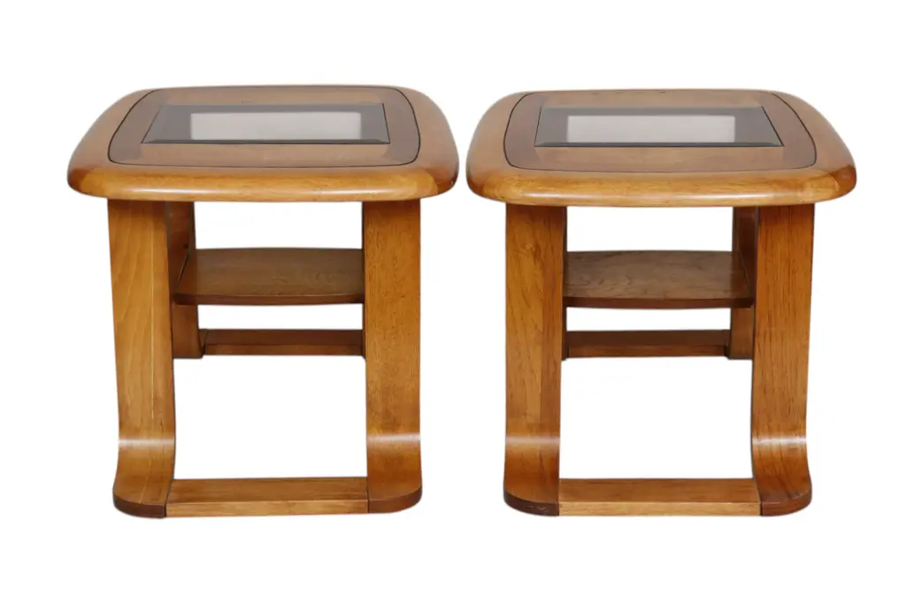 A pair of mid-century bentwood glass top side tables. Rectangular tables are made of maple, decorated on top with triangular panels, banded rounded edges with beveled details, and inset with beveled smoked glass. Bentwood legs are turned outwards in opposition to bentwood supported shelves. Signed underneath. Dimensions per table.