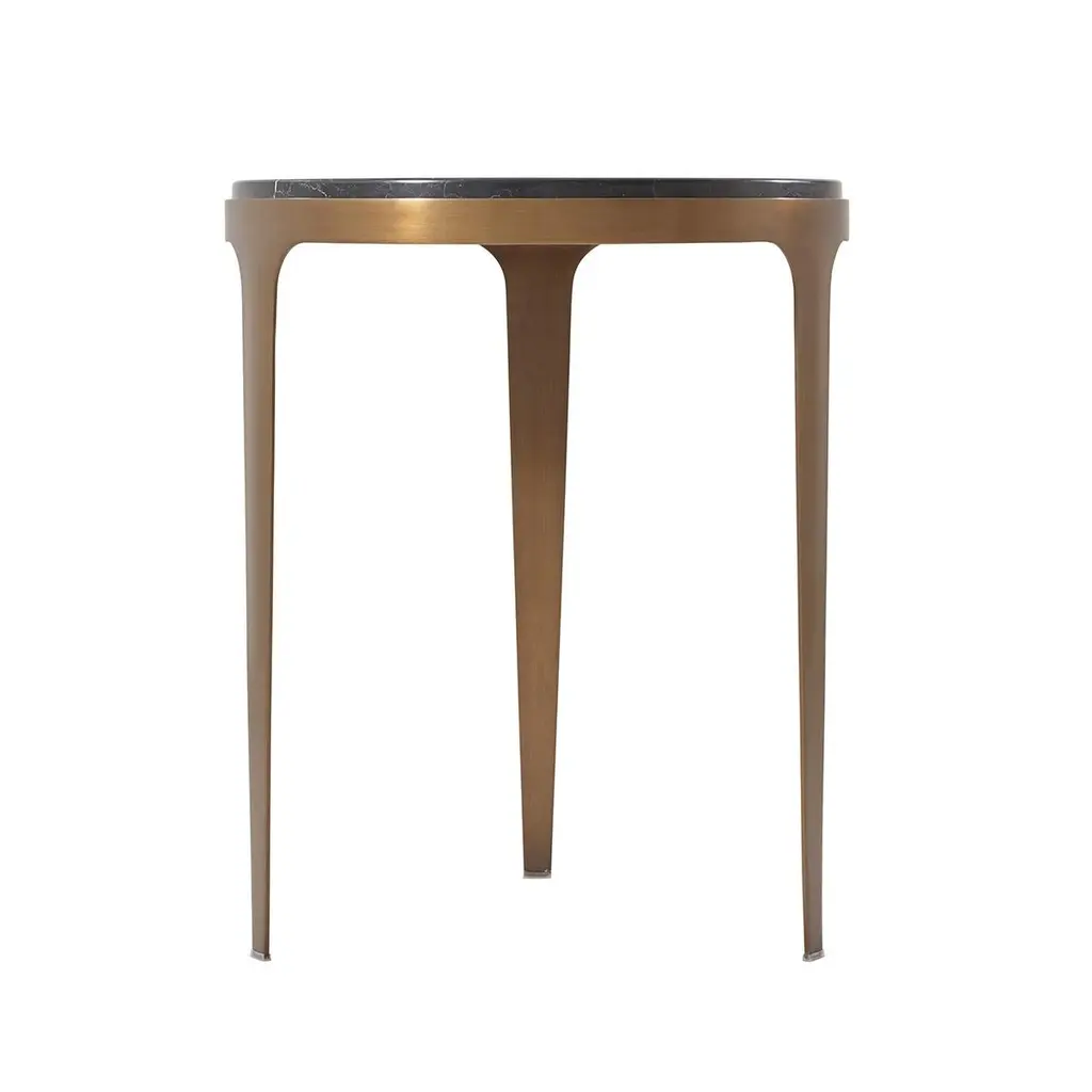 With a round black marble top on a brushed brass finish metal base with tapering legs.Dimensions: 19.75" W x 19.75" D x 23.5" HMarble has natural variations and its figure may vary from piece to piece