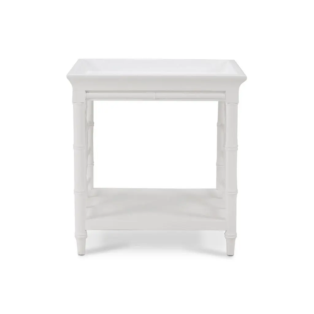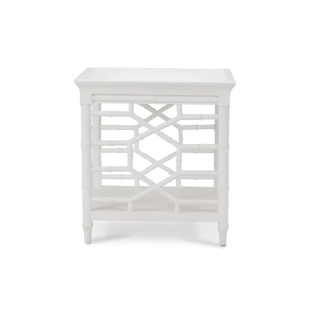 Crafted with meticulous attention to detail, this table combines functionality with a sleek, timeless design. The crisp white finish and bamboo-inspired ends exude a chic vibe that effortlessly complements any decor.The table has an unusual deep dish top gallery. Inspired by English 19th-century faux bois design, the elegant bamboo style frame adds a touch of sophistication and charm. Its clean lines and open design make it a versatile addition to living rooms or bedrooms, seamlessly fitting into both mid-century modern and traditional interiors.Dimensions: 24" W x 24" D x 25" HCustom finish options are also available. Contact us to learn more.