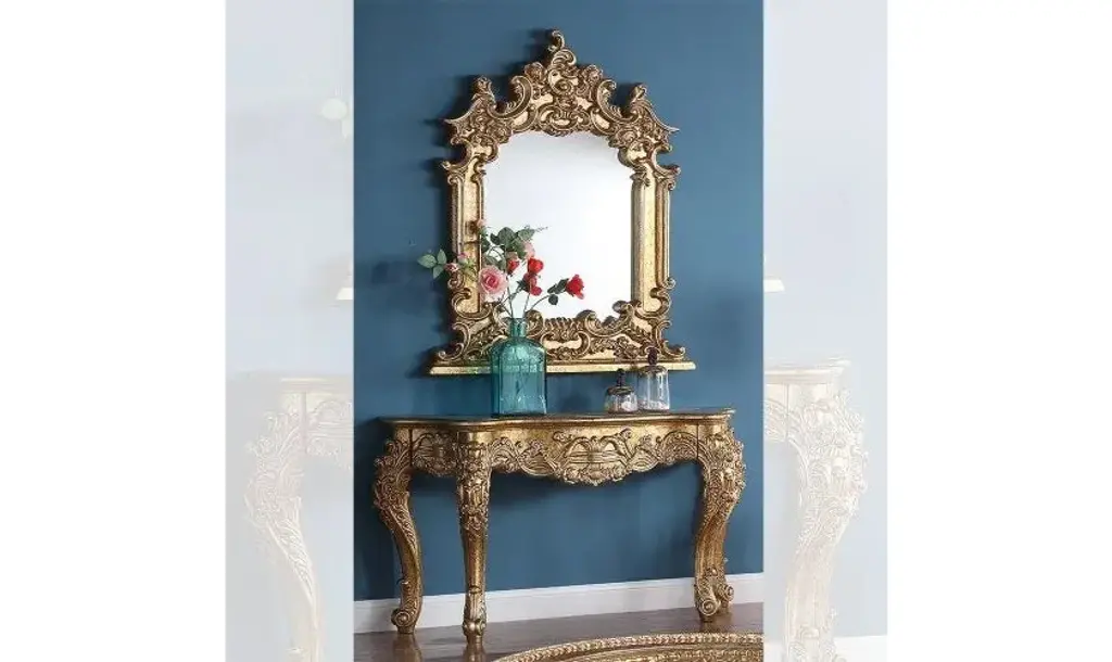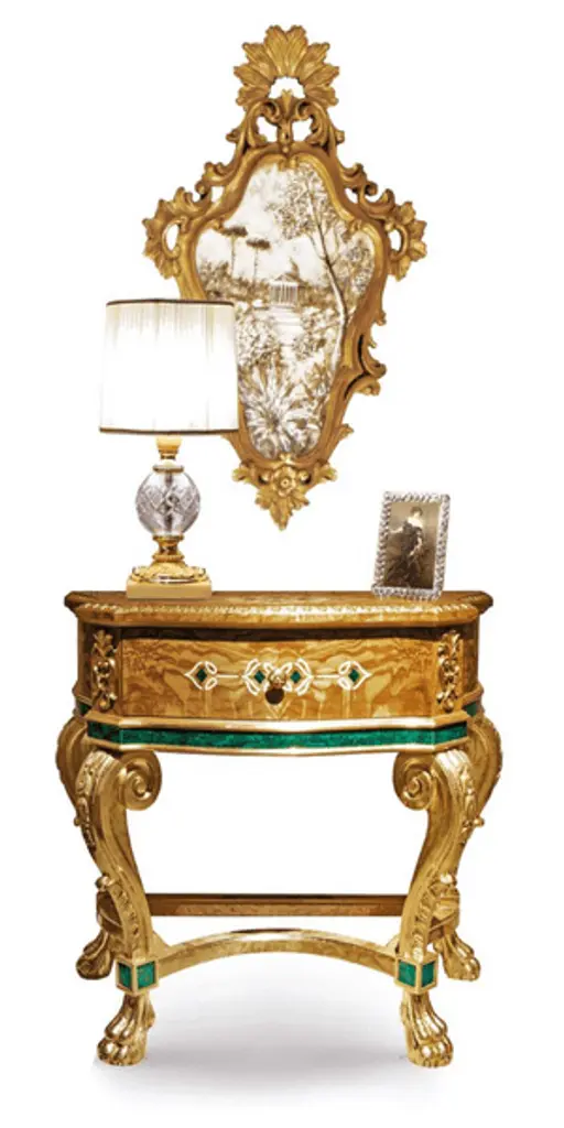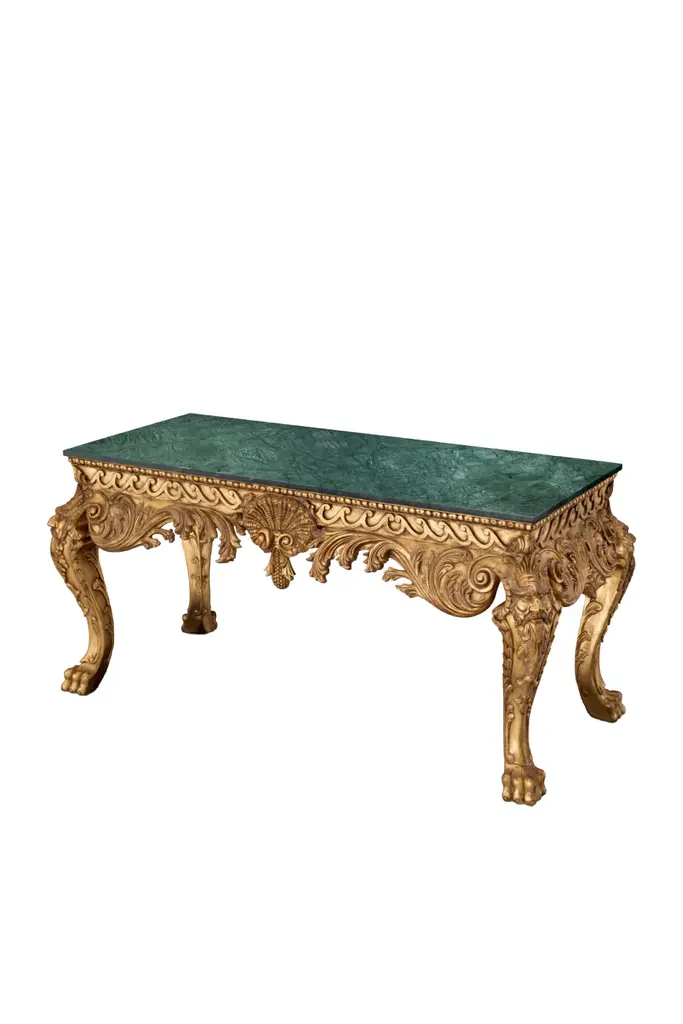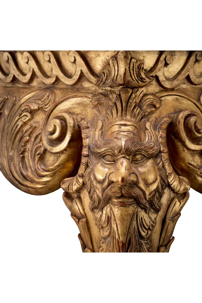 Behold the "Console Table Matthias", an icon within The Met x Eichholtz collection. With its antique gold finish and stunning green marble, this handcrafted masterpiece boasts a unique character, with each piece displaying distinct variations. Inspired by Matthias Lock's designs, it features intricate details like shell motifs, classical masks, lion's paws, and rich acanthus leaves. The water gilding adds a touch of brilliance, making it a timeless addition to your home.