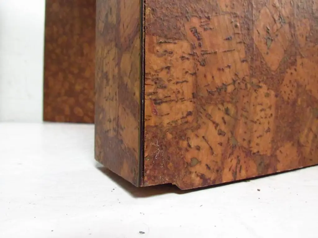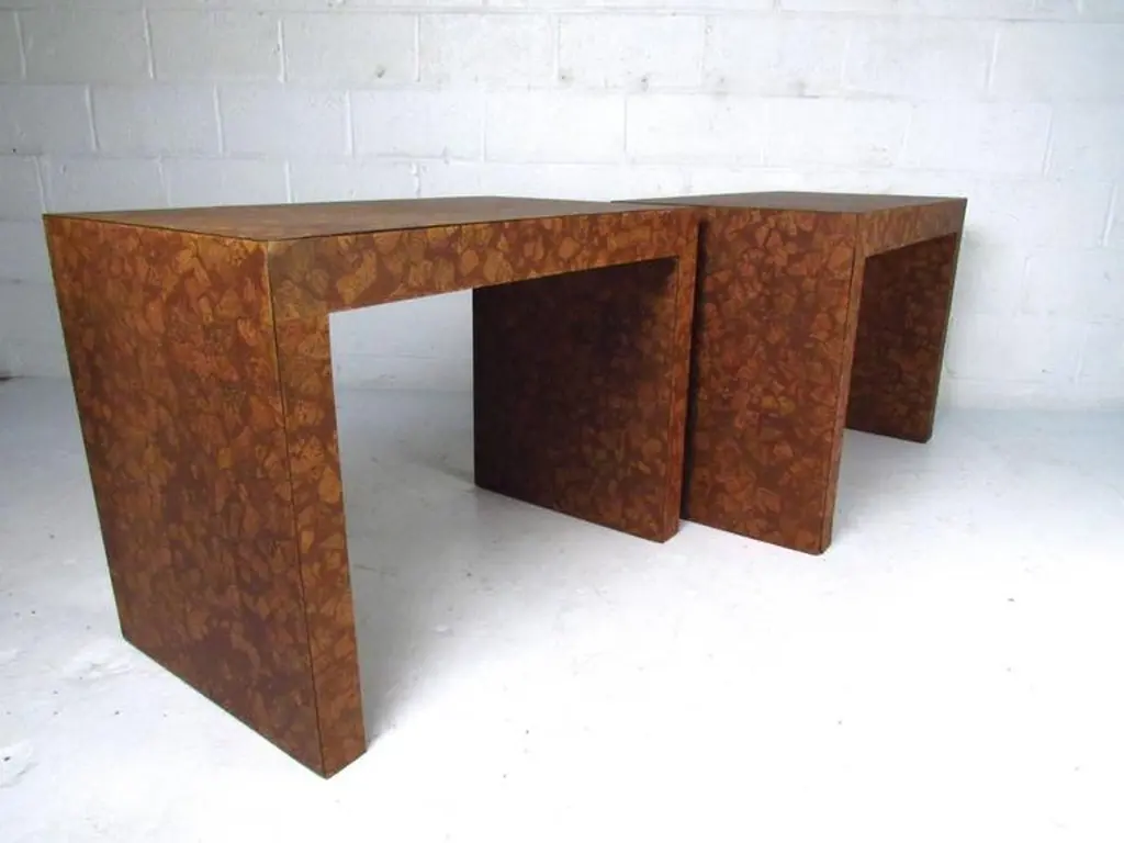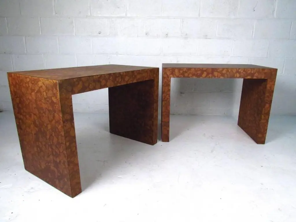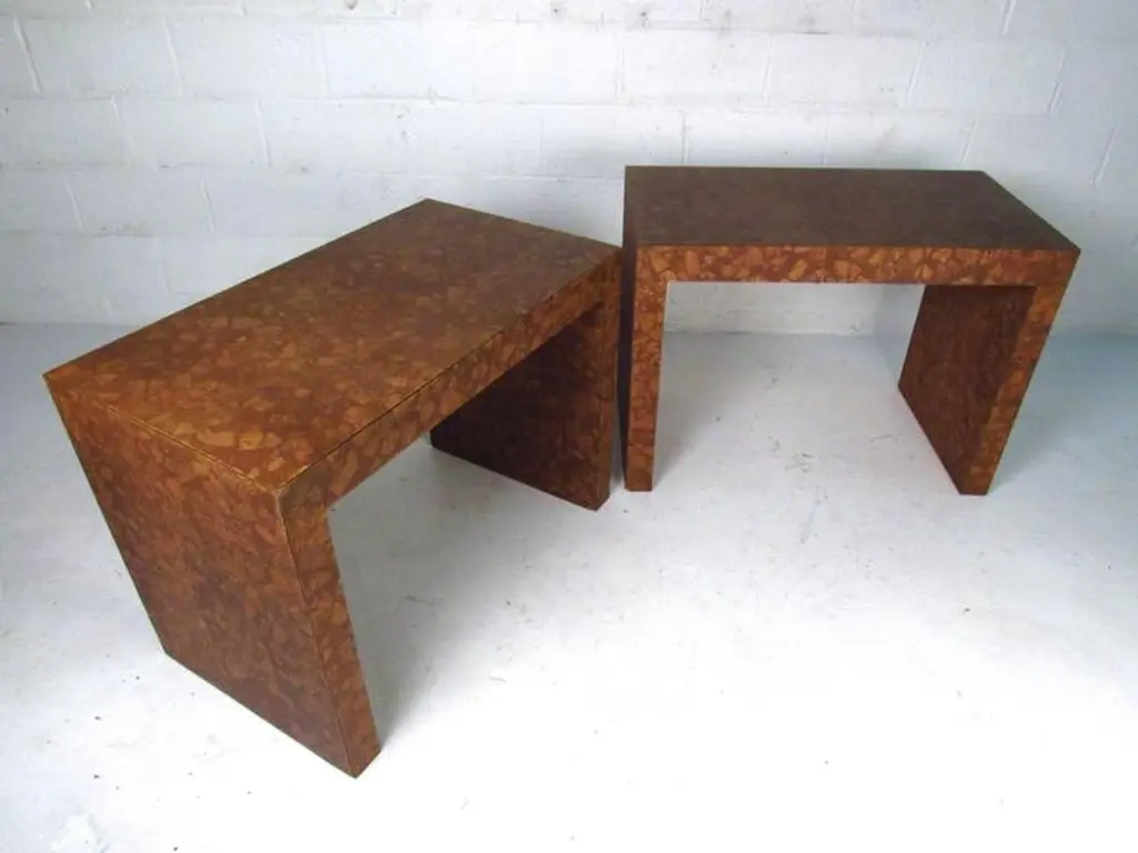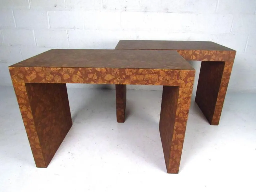 This listing is for one of the two available tables, unique burl cork veneer and parson style design sets these apart from other vintage side tables. These versatile tables offer a variety of uses and are prepared to add a stylish vintage accent to any interior. Please confirm item location (NY or NJ), contact for availability (price is for one, two available).