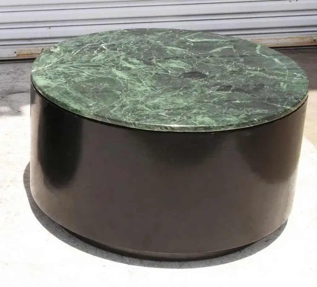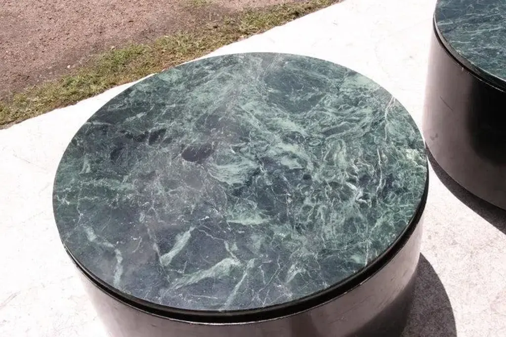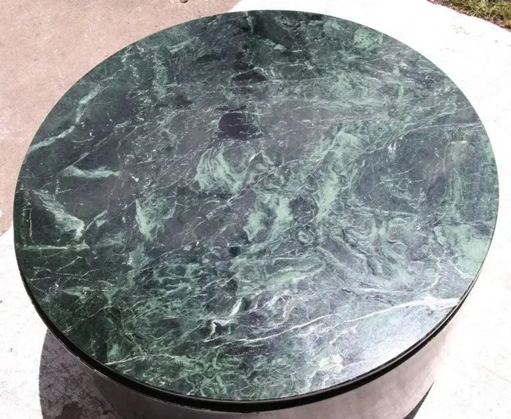 Mid-Century Modern Paul Mayen Style Green Marble Top Drum Side Table Stunning vintage Paul Mayen style marble top cylinder drum side or end tables. Richly marbeled with black and green veining. 2 Available. Dimensions: 36" x 36" x 20"