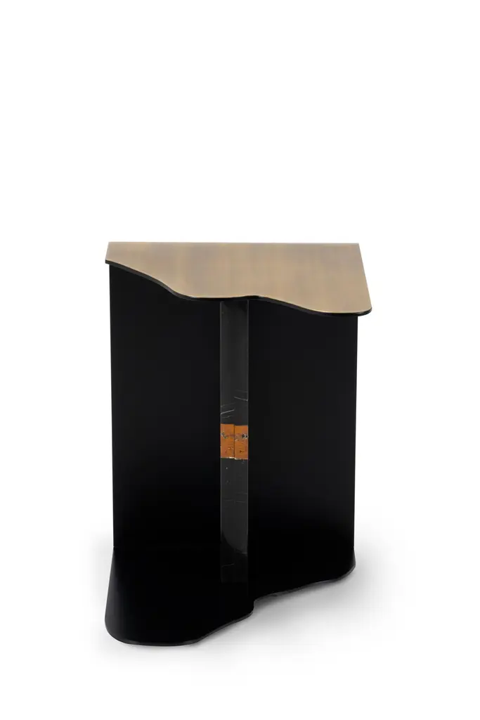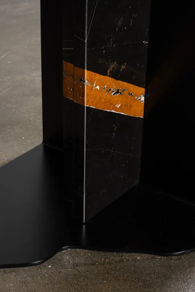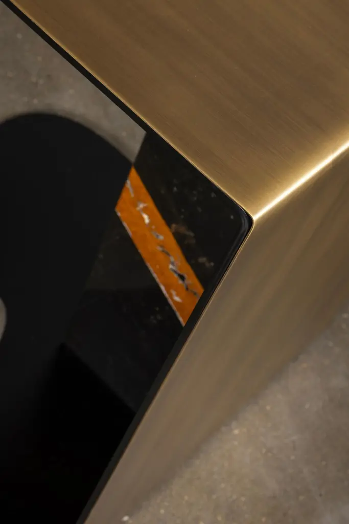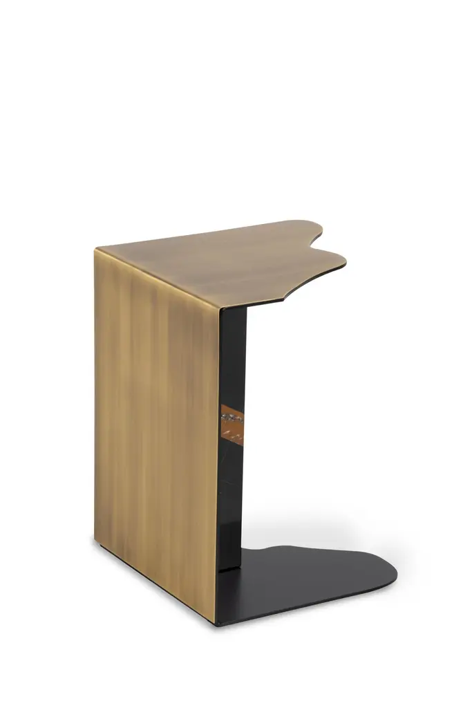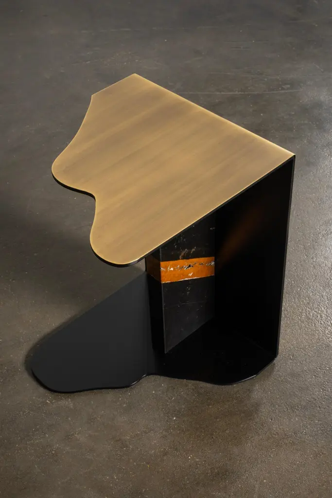 Mid-Century Modern Raw Side Table, Contemporary Collection, Handcrafted in Portugal - Europe by Greenapple.The Raw marble side table celebrates the interplay between refined craftsmanship and nature’s raw beauty. Its organic silhouette, inspired by the unpredictability of natural forms, is paired with noble materials to create a piece where simplicity emerges as the ultimate form of sophistication. With its sculptural presence and timeless design, the Raw marble side table is the perfect eye-catching piece for contemporary interiors.The Raw side table features a metal structure with an outer shell crafted from antique-brass with a matte varnish and an inner shell lacquered in satin black.Base block in polished Sahara Noir marble in black and orange tones.The Raw side table can be customized in terms of dimensions, materials and finishes. Raw Side Table Material CodesFI007 Lacquered, Black, SatinME032 Brass, Brushed, Burnished, Varnished, Antique-Brass, MatteST041 Sahara Noir Marble, Polished, Black-Orange, GlossHandcrafted in Portugal - Europe by GreenappleUnique by design, Crafted by peopleGreenapple transforms contemporary spaces into exclusive narratives of design and craftsmanship. From custom-made furniture to bespoke interiors, each creation is a timeless work of art, shaped by master artisans who honor centuries-old techniques.Founded in 2005 by Sérgio Rebola and Rute Martins, Greenapple has earned global recognition among high-end clientele and leading design firms. While Rute designs each unique piece, Sérgio ensures uncompromising quality from design to production and from production to your home. We provide a seamless experience, offering short production lead times, worldwide delivery within 7 to 10 days, and white-glove service upon request.For U.S. clients, we can handle customs clearance, and offer white-glove service as well upon request.End Table, Accent Table, Drink Table, Utility Table