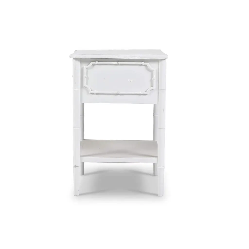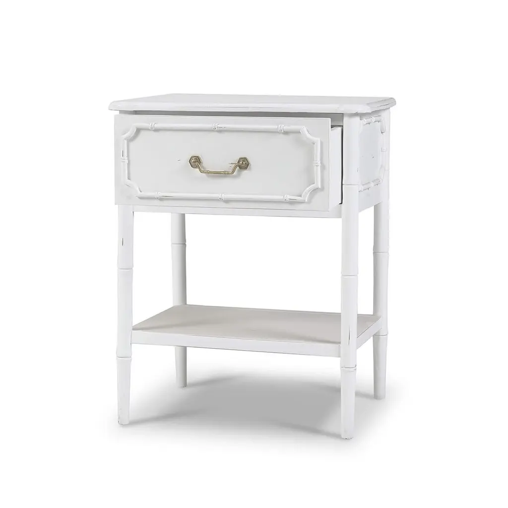 Influenced by the English Regency period, this exquisite piece features a sleek, lightly distressed architectural white-painted finish that effortlessly brightens any room. Its elegant faux bamboo design brings a touch of nature-inspired charm, seamlessly blending with mid-century modern aesthetics. Adorned with chic gold handles, this dresser adds a hint of sophistication and glamour to your living space.Perfect for bedrooms or beside your favorite seat, this versatile table combines functionality with timeless style. Dimensions: 24" W x 20" D x 29" HCustom finish options are also available. Contact us to learn more.