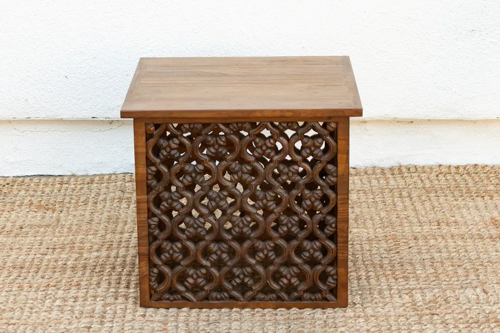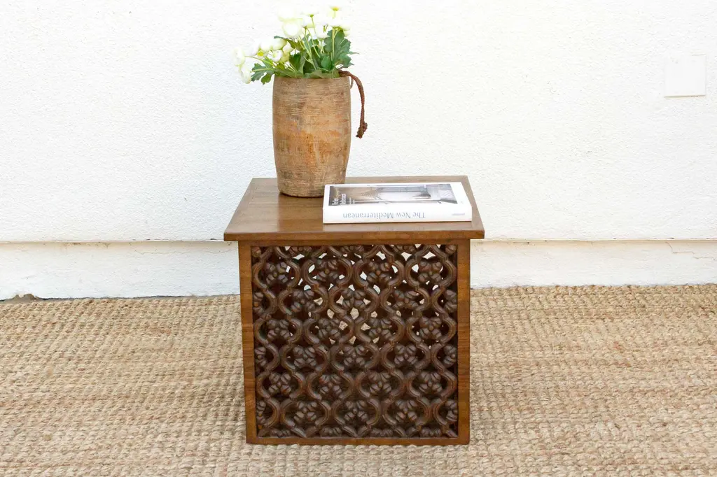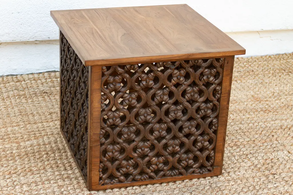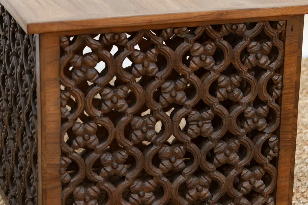 This small finely carved end table reimagines mid-century modern style with an exclusive De-cor touch. The frame features a captivating, hand-carved, see-through floral Jali design adorning all sides, drawing inspiration from the historic Mehrangarh Fort. This intricate motif adds a touch of Indian heritage to the table's clean lines and sleek silhouette. A simple, clean reclaimed wood top offers a versatile platform, while a rich brown wax finish showcases the natural beauty of the wood.