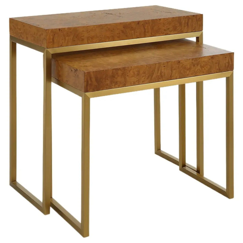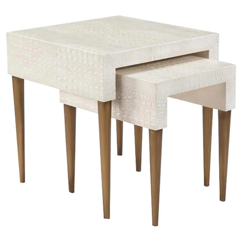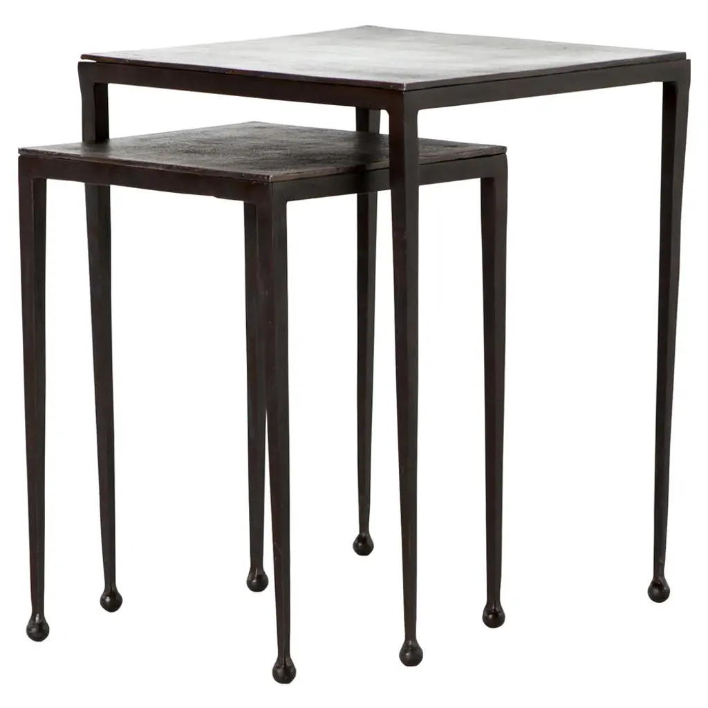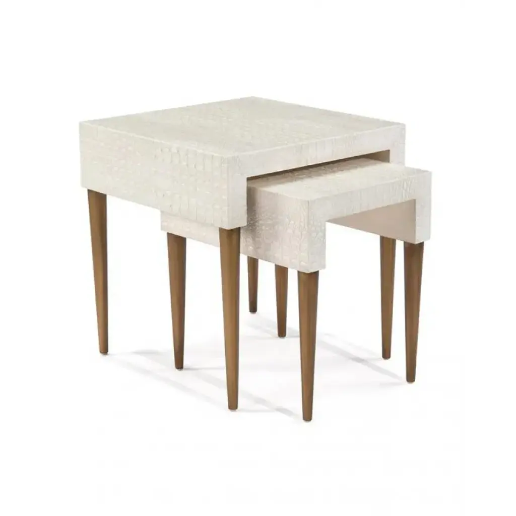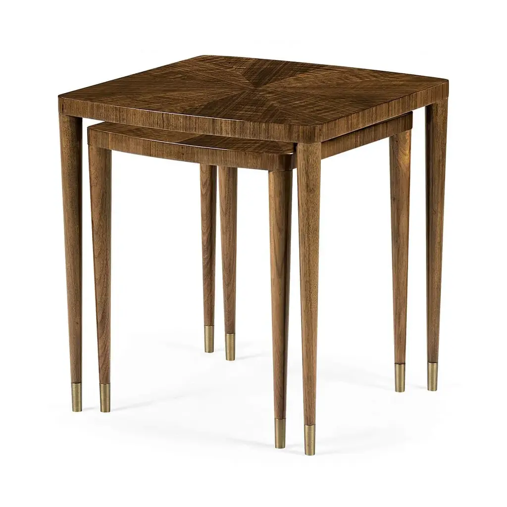The side tables are sculpted from American walnut with a hand-rubbed lacquer finish and brass ferrules. Hardware is acid dipped and hand-rubbed to achieve a rich, natural patina. Dimensions: 22" W x 22" D x 24" H