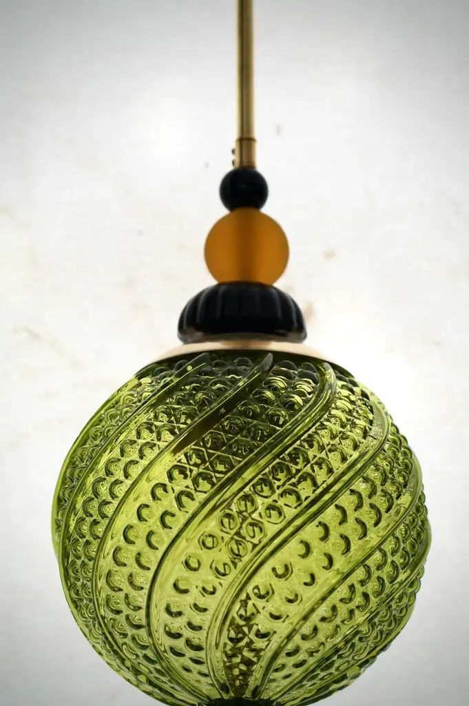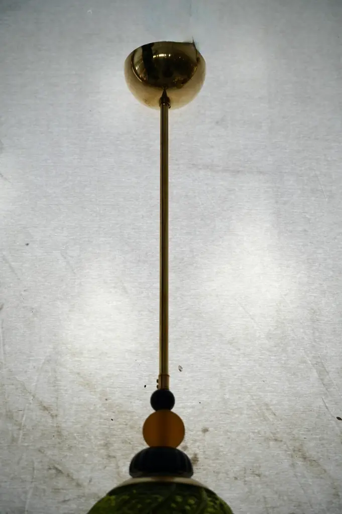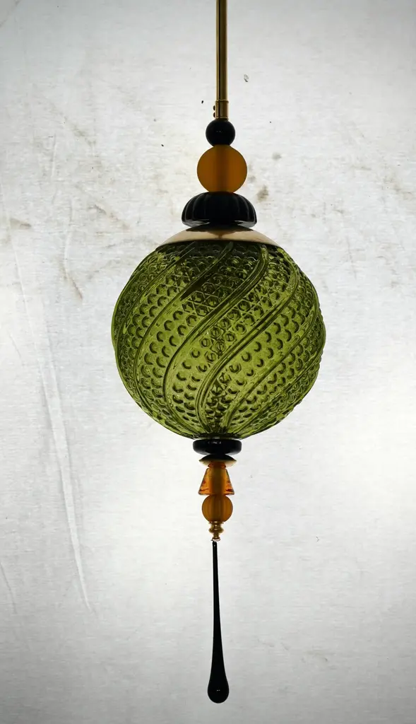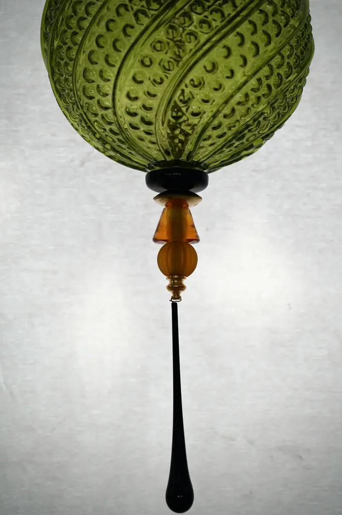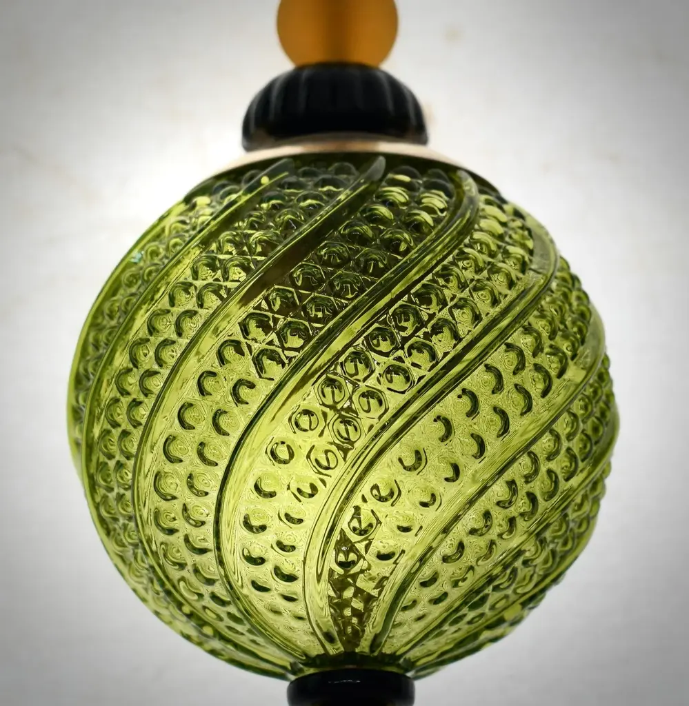 Precious Murano blown glass lanterns, whose colors are unique and range from green to black, passing through amber. These are very elegant and refined objects, which can be placed in different points of the house, for example hung from top to bottom above the two bedside tables, or to give life to the ceiling of a long corridor. The lanterns are composed of a large golden sphere of green color, which contains the light bulb, surmounted by a transparent saucer and a pair of smaller spheres of black color. In the lower part, however, there is a tip formed by a series of small spheres of amber and black color. The large green Murano glass sphere is very elegant, as can be seen from the photos of the details. As a final pendant, the chandelier has an elongated black drop. Wear consistent with age and use. Up to 250V (Europe/UK Standard).The wiring of this item may be original and might need replacement, if not specified otherwise.
