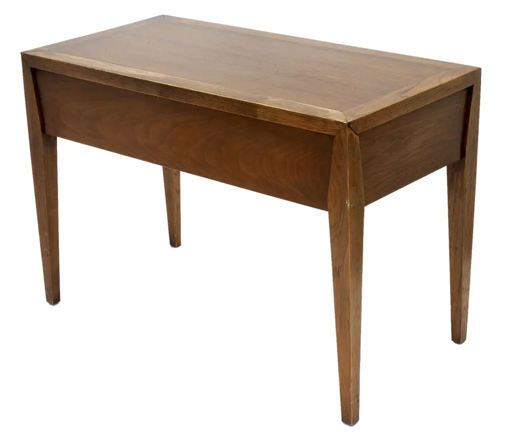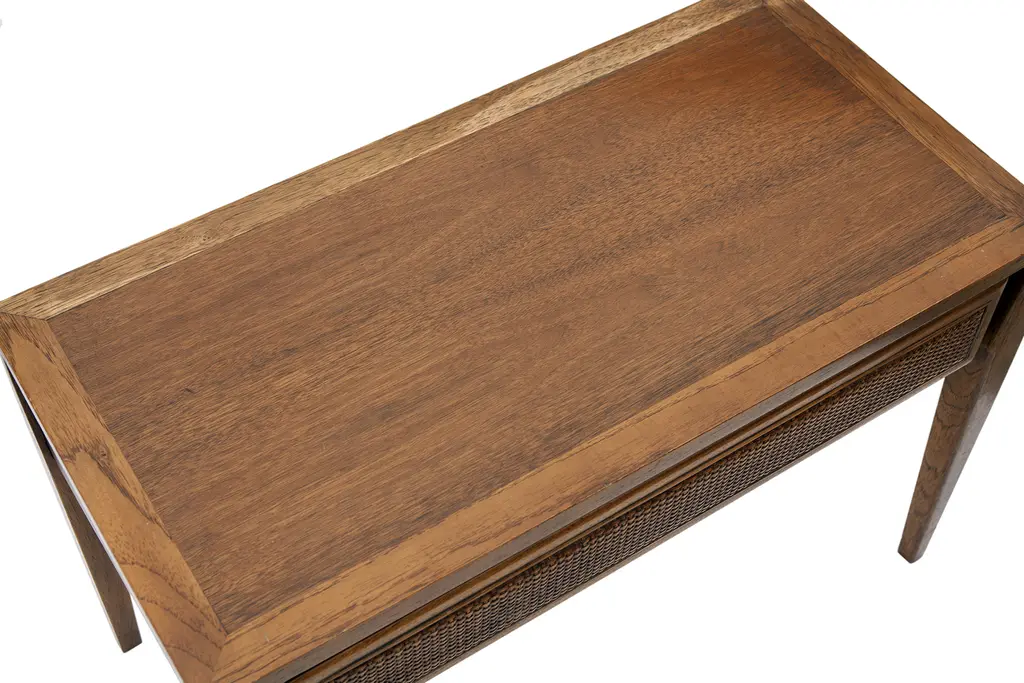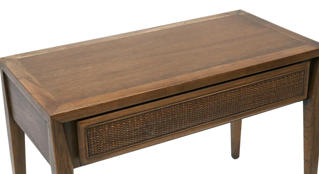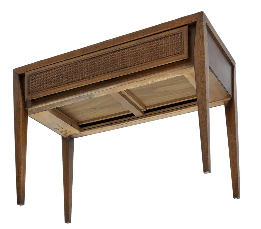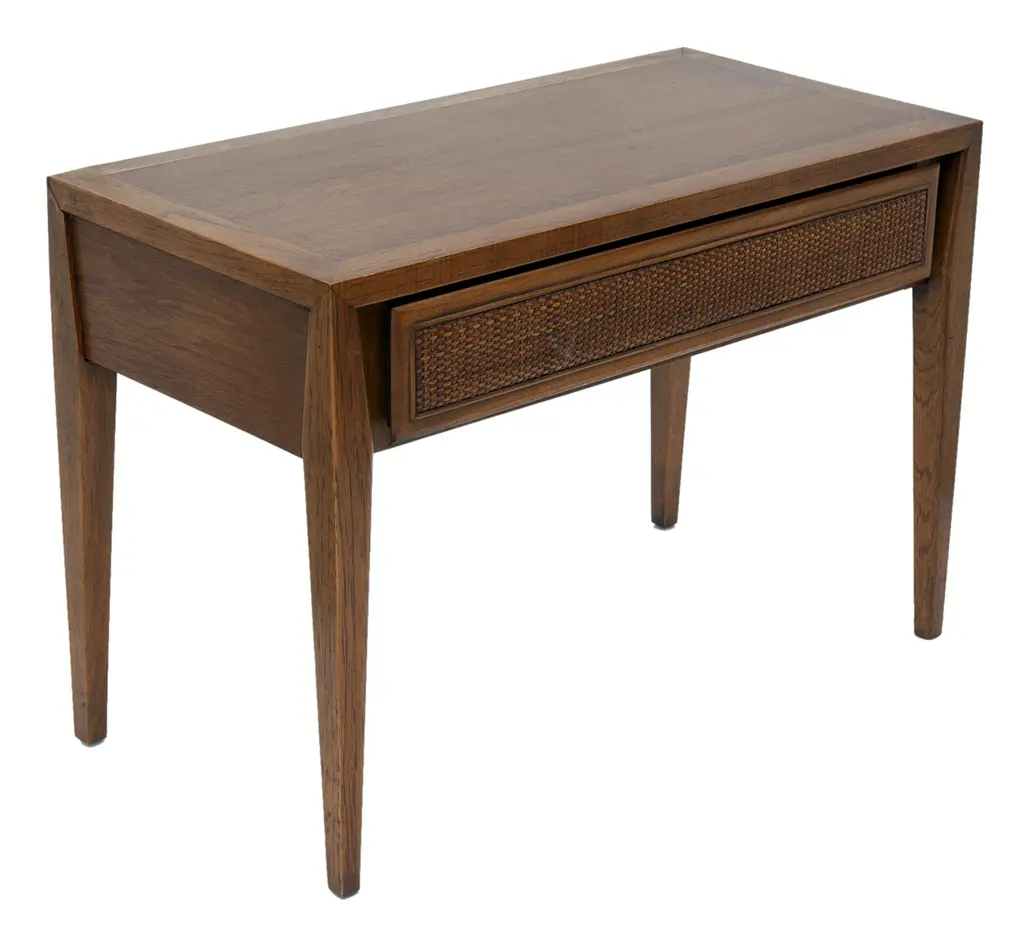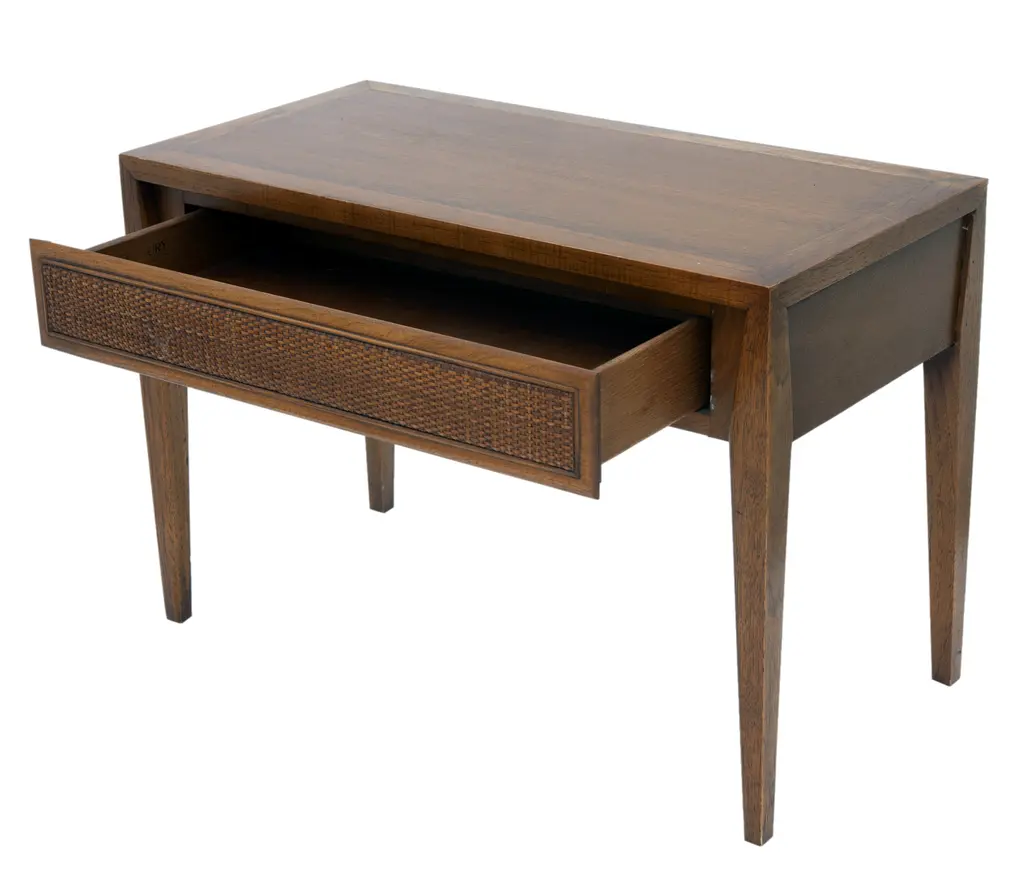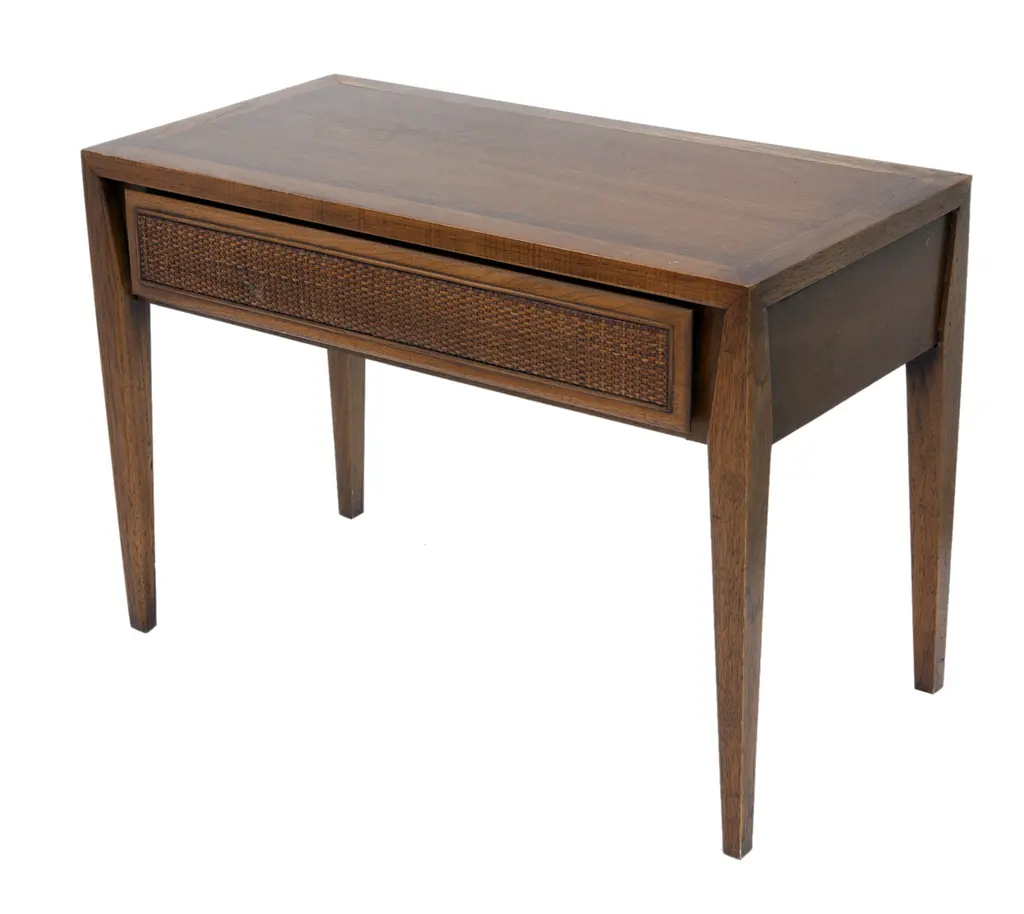 Midcentury modern walnut side table with woven wicker drawer by Century. The table has four sleek tapered legs, the table is in very good condition.