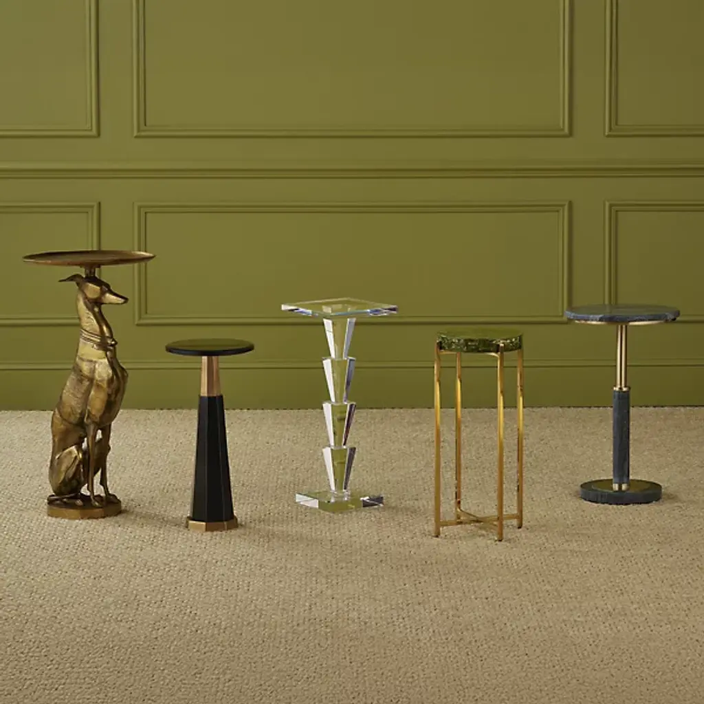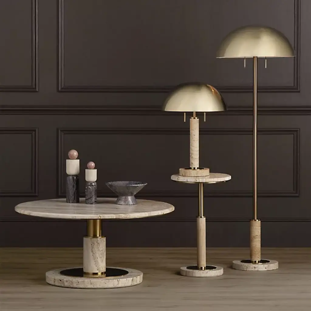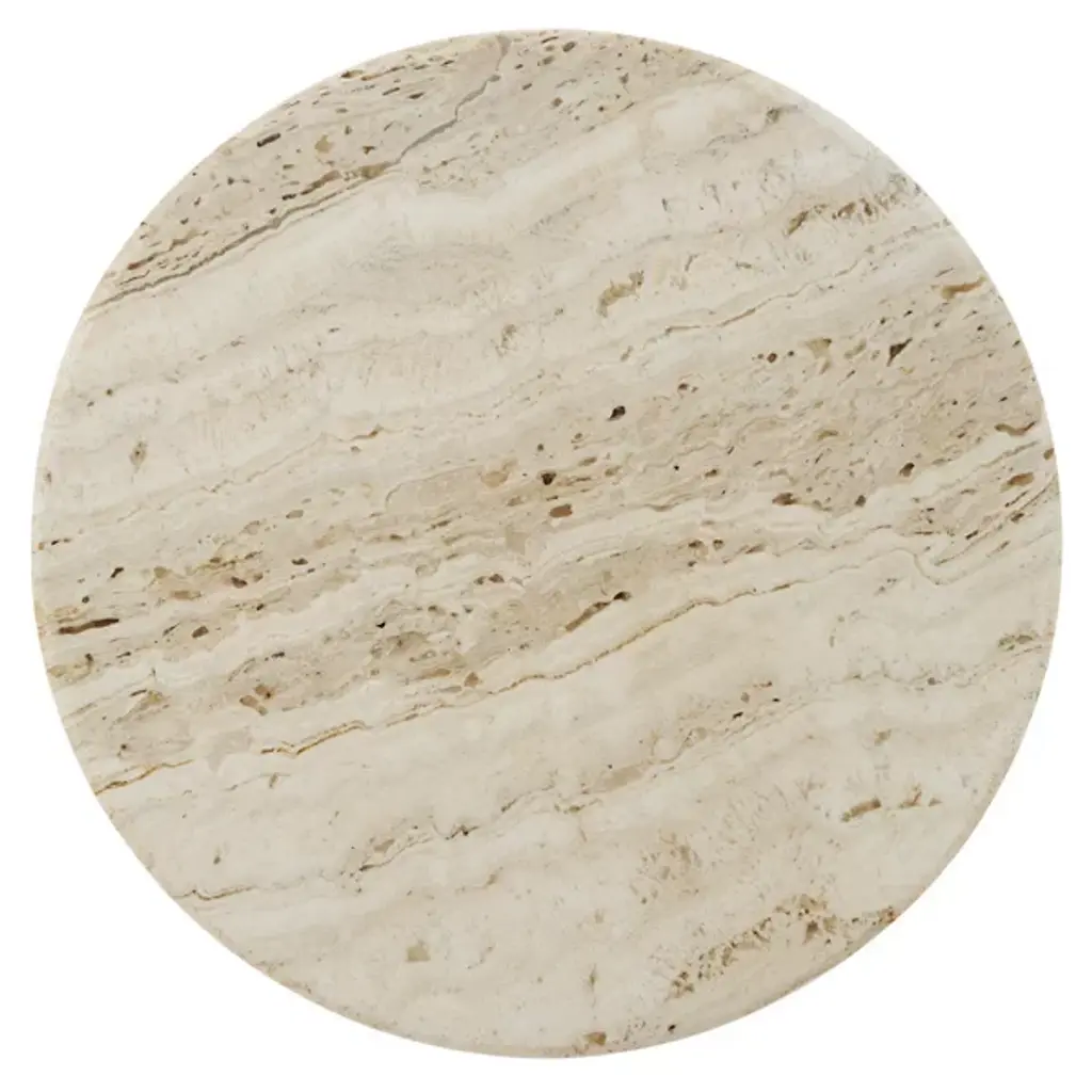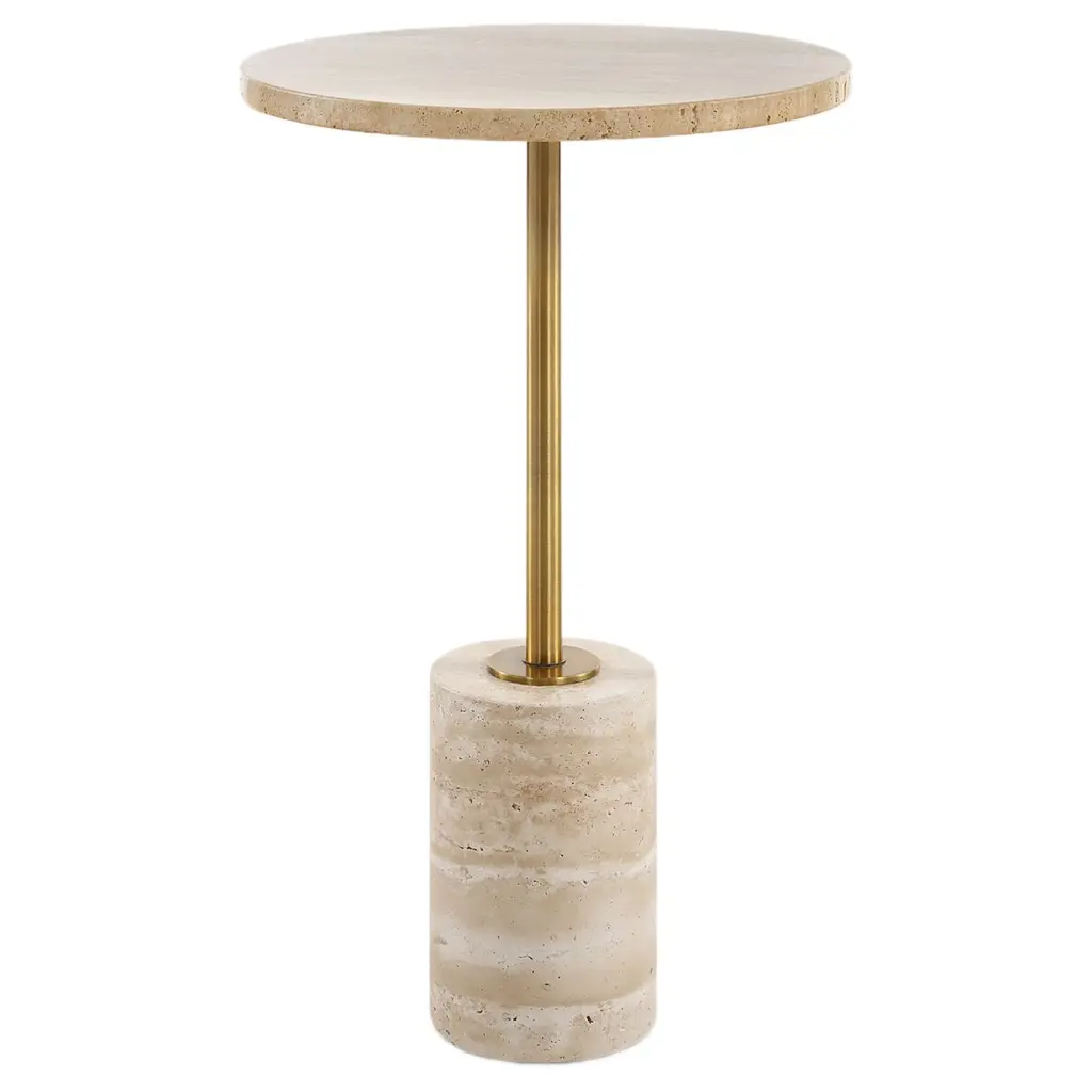 The Miles Travertine Accent Table from Currey & Company celebrates the raw elegance of the travertine, showcasing the stone's unique patterns and textures. The circular top appears to float effortlessly above a cylindrical base connected by a slender metal column. The combination of travertine and metallic accents creates a luxurious contrast, balancing organic and man-made elements. This table proves that simplicity can be extraordinary, offering a timeless design that complements a variety of interiors while making a statement of its own.