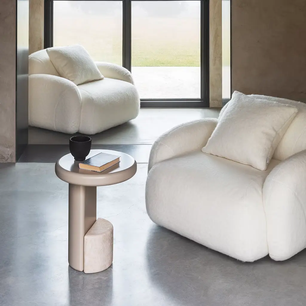 The Milestone side table is distinguished by its bold, milestone-inspired base made from natural stone, shaped with softened lines to provide stability and unique character to its flowing structure. Milestone offers versatility as a striking focal point in any room, ideal for all-day enjoyment. The wood finish is Fumè, and the marble stone option is Travertino. It is available in other colors and finishes, please contact the concierge for more information.
