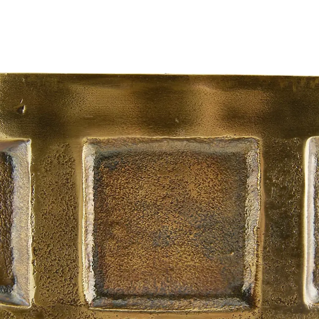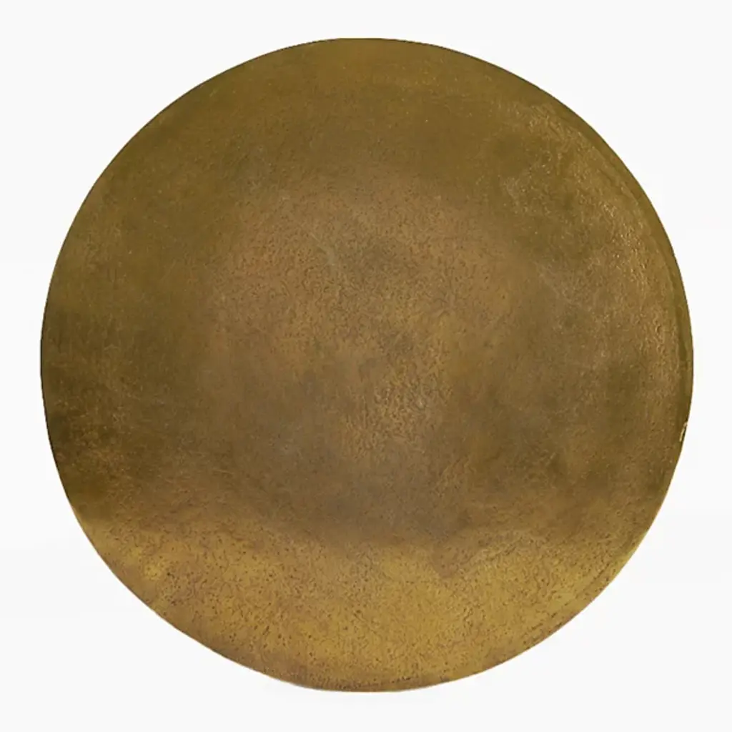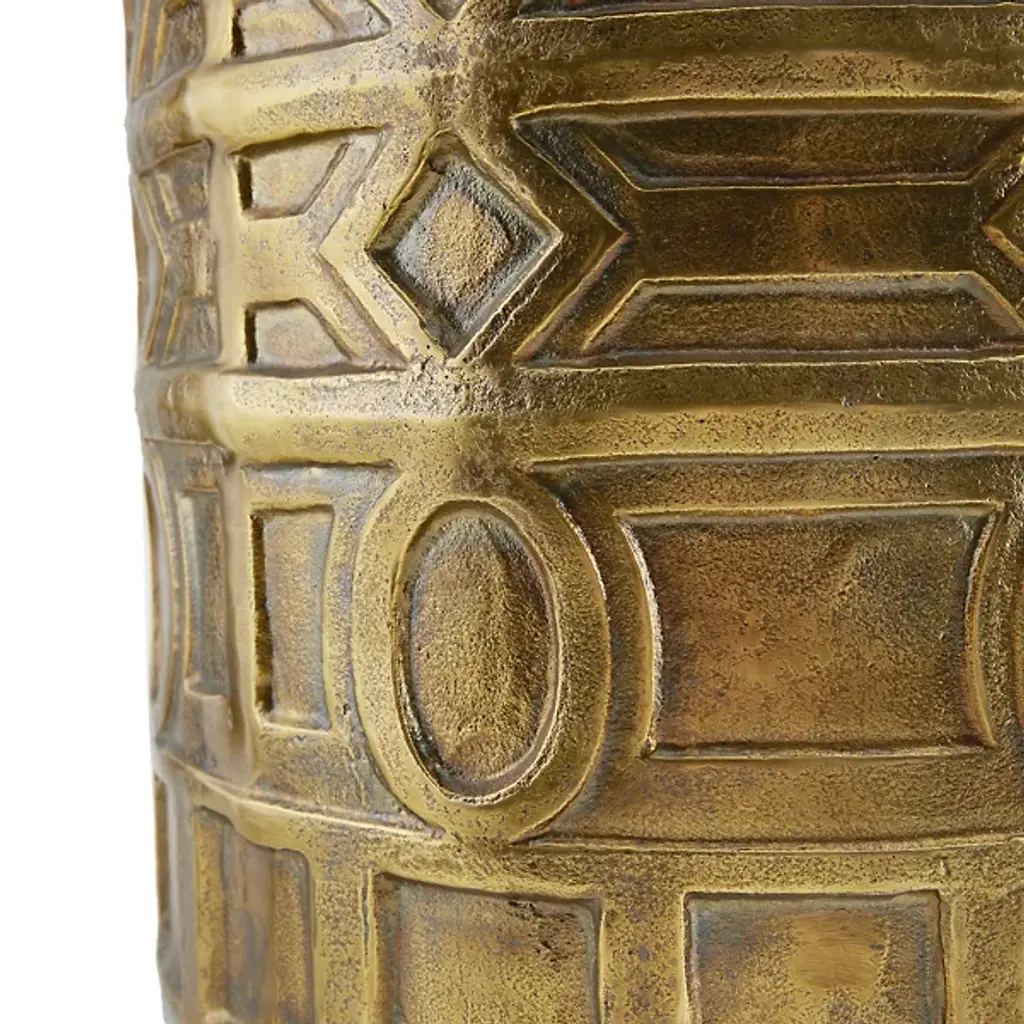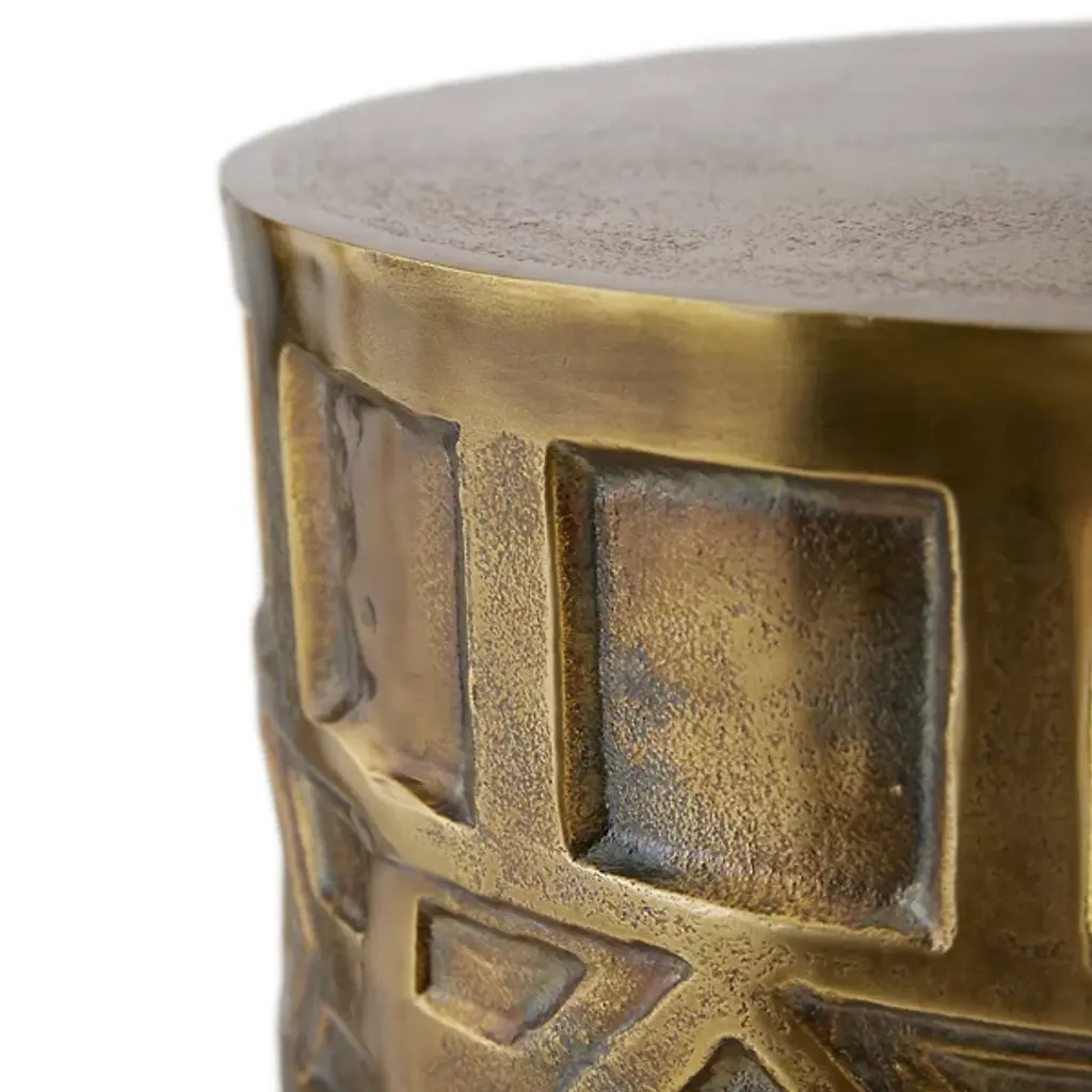 The Millenia End Table from Arteriors gives a valuable vintage appearance to its surroundings. A sophisticated cylinder embossed with intricate geometric details, its aluminum surface is artfully antiqued with a brass finish. The rich metallic surface forges a textured, rich appeal, contrasting well with the smooth circular top above. Able to work well as a bedside table or an accent alongside a sofa, it is artistic and impactful, leaving a lasting impression.