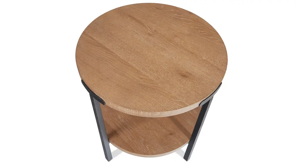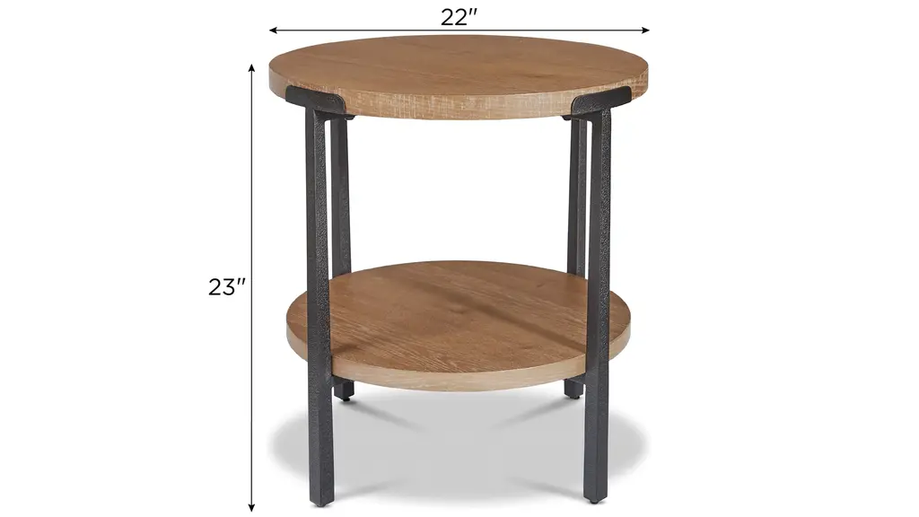 Millwork End Table makes a captivating statement in any living space. A textured steel frame is highlighted by warm copper undertones, while a distinctive wood top and lower shelf exude character with natural knots, subtle saw marks and a white ceruse finish that accentuates the rich umber wood grain.