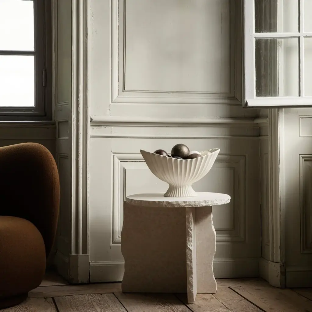 Whether you use it as a side table or as a decorative sculpture, the Mineral Sculptural Table makes an impactful impression in your home. Made in 100% bianco curia marble, it is a real statement piece, and with edges that are broken by hand with a chisel, each table is unique. Characterised by its distinctive T-shape, rough edges and contrasting polished surfaces, it has a raw, brutalist expression that will spark conversation.