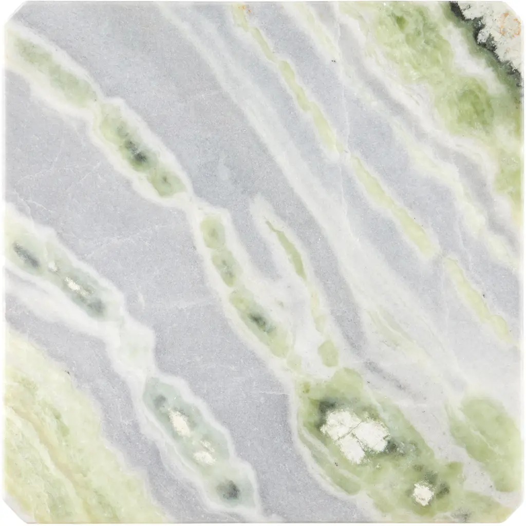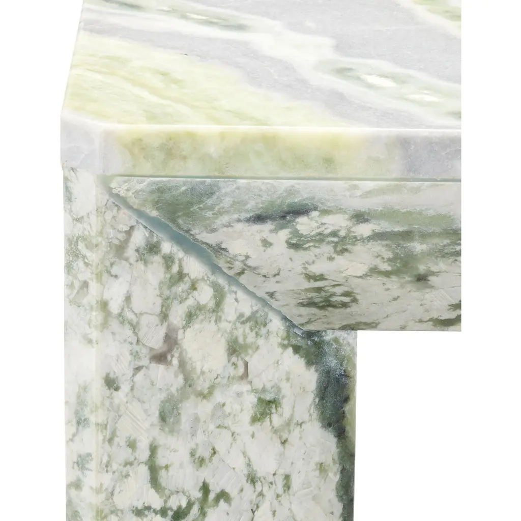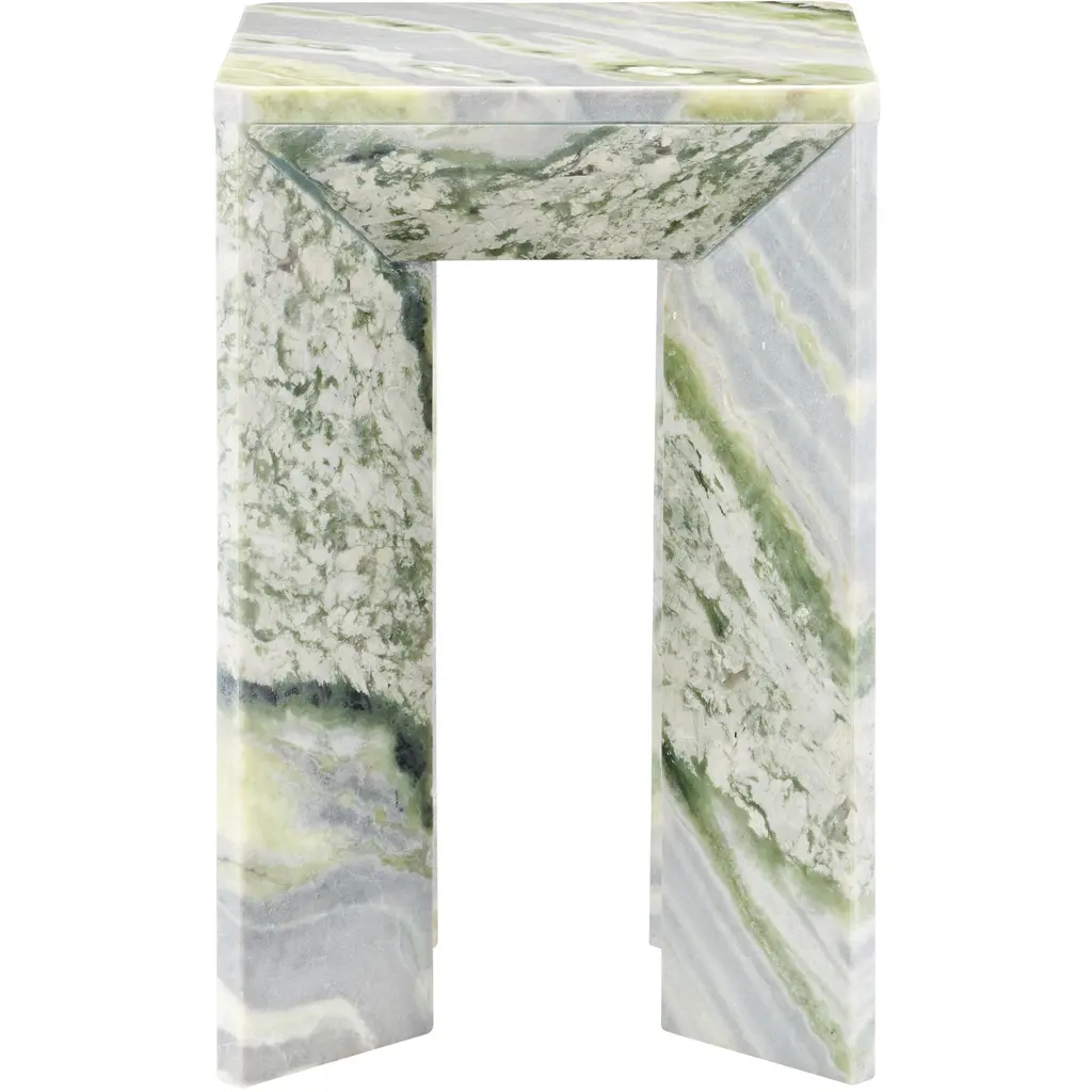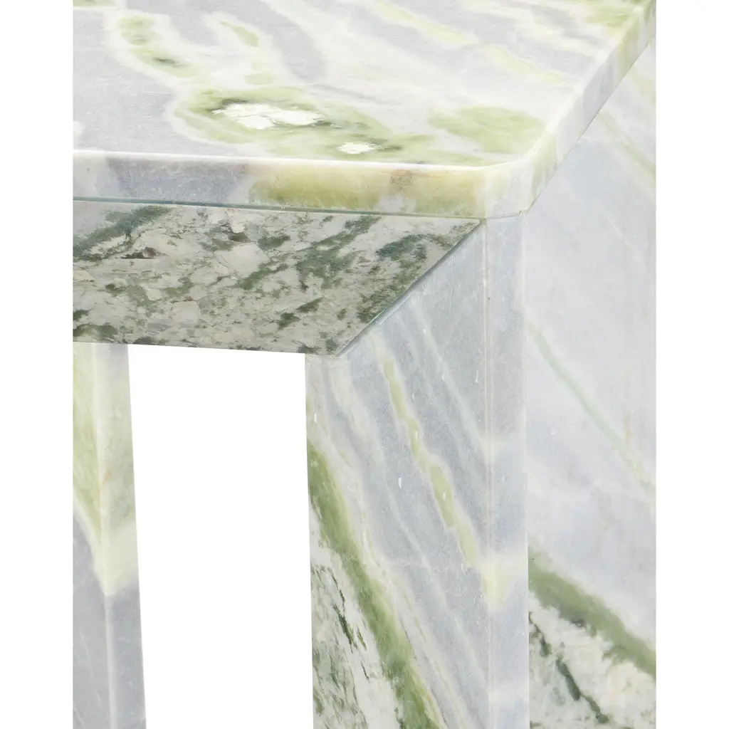 A captivating showcase of natural beauty and refined craftsmanship, the Minerale Green Onyx Accent Table is made from richly patterned green onyx, its surface adorned with striking veins of green, gray, and beige that make each piece unique. The square table has an angular design with a chamfered top that descends into a nice apron, a receding quality that is mirrored by its legs.