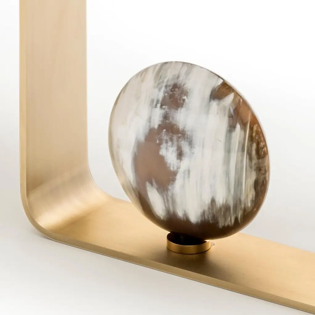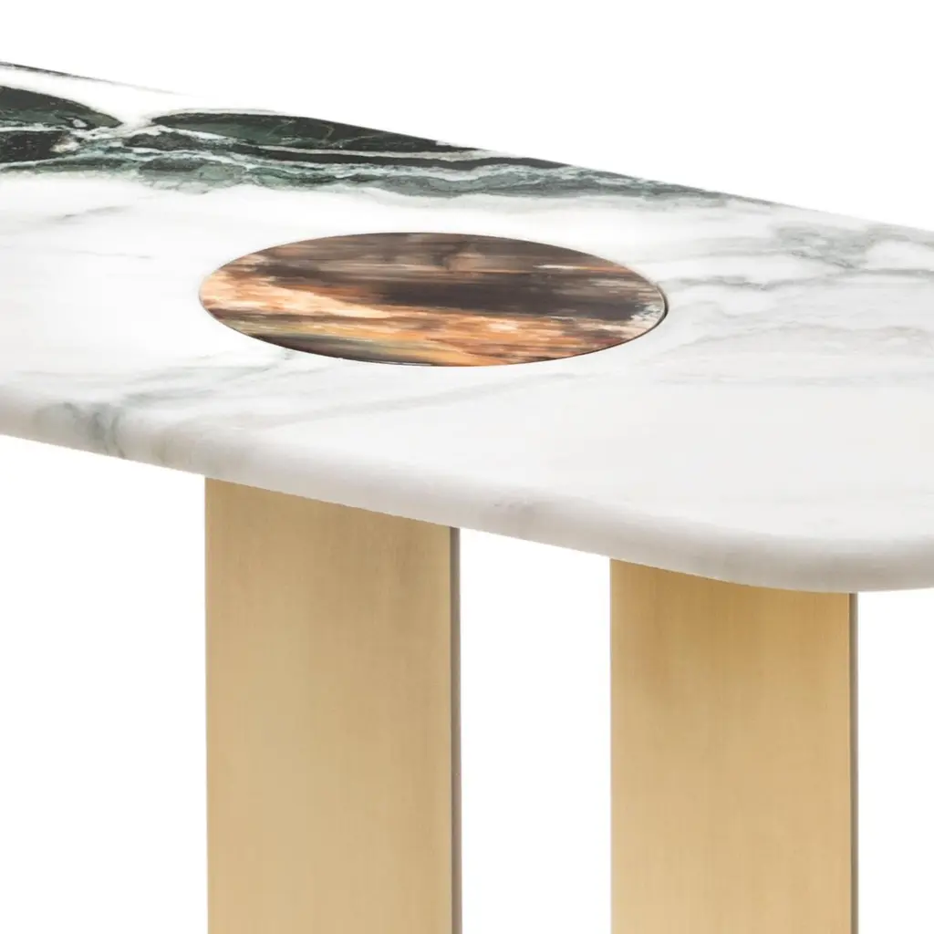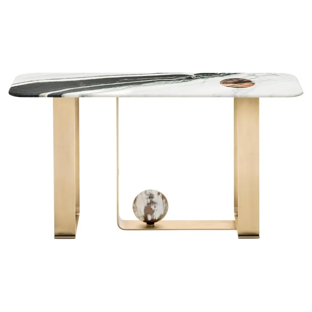 Designed by nature and perfected by expert master craftsmen, our Minerva console table will make a superb addition to a hallway or under a grand mirror. Featuring an elegant top in satin Dalmata Marble with an unprecedented marquetry in Corno Italiano with gloss finish, this console table is a lush interplay of complex textures and subtle natural veins. Sat atop a sleek structure in satin metal, embellished by a decorative sphere in Corno Italiano, Minerva will imbue a contemporary home with sophisticated elegance.Note: Colors and shades of Corno Italiano processed by our Company are unique and due to the natural origin of raw material. For this reason Corno Italiano tones that can be seen in pictures are indicative and can not be reproduced in finished products.