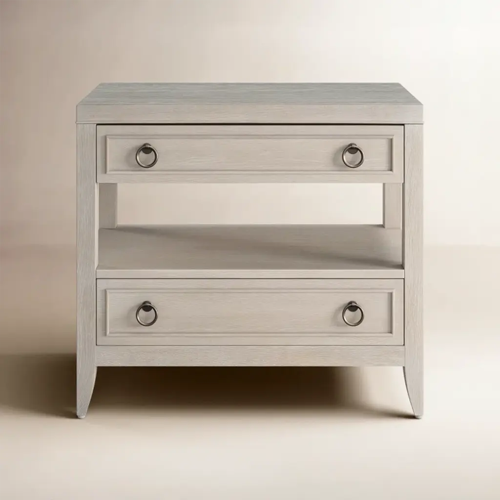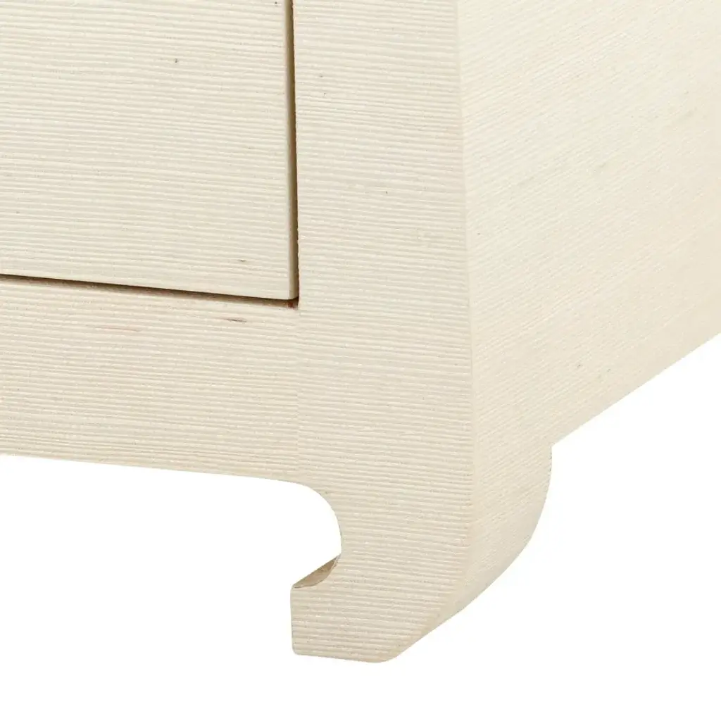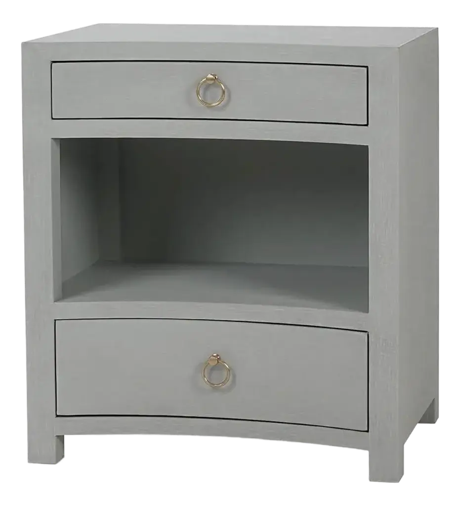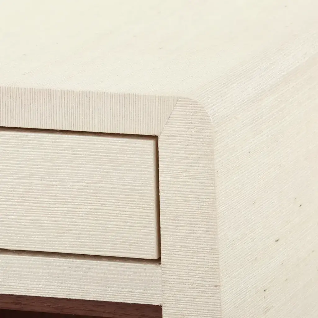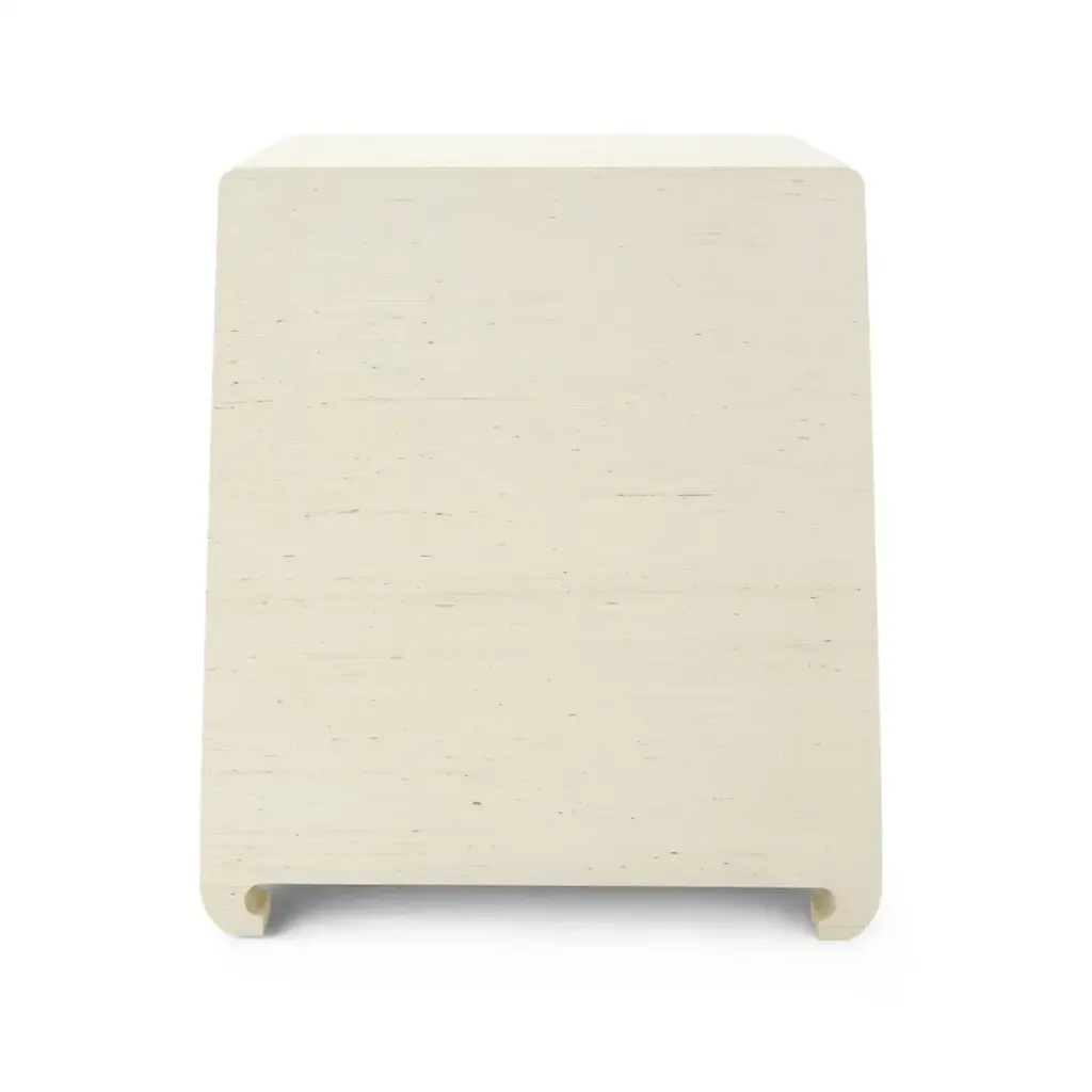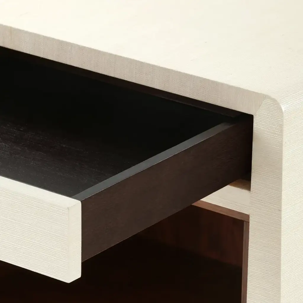 The stately pieces of our Ming Collection radiate worldly sophistication and contemporary class. Handsomely tailored in both form and finishings, the Ming 2-Drawer Side Table in Canvas Cream boasts a subtly graduated silhouette, soft corners, and thoughtfully-applied details, such as an open, inset shelf that allows for decorative display, and delicately curved Chow-style feet. Two drawers adorned with polished brass ring pulls supply convenient hide-away storage, each with rich stained wood interiors. Draped in lush, textured grasscloth with a lacquered finish, the Ming elevates its surroundings with its refined presence. Perfect for pairing on either side of a bed or sofa, where it will get plenty of use.