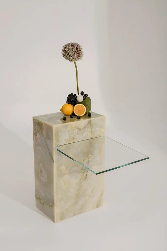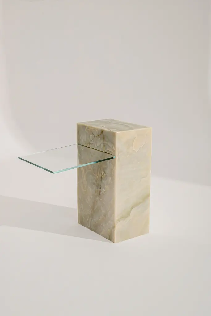 Ceres Green Onyx Side Table by RAFFINATODimensions: D 30 x 50 x H 50 cm.Materials: Green onyx and glass.This table is available in different stone options: Red Travertine, Light Travertine, Green Onyx, Rosso Levanto, Blue Onyx, White Onyx, and Pink Onyx. Please contact us.Ceres Table is identified by its classy look. It serves as a tribute to the unmatched beauty and pristine quality of its materials. With its clean lines and precise silhouette, this table becomes a standout piece for any interior setting. Whether your decor leans towards classic or contemporary, the Ceres Table seamlessly fits in as a side table or bedside companion. Beyond its functional aspect, it adds significant aesthetic appeal to your living space.RAFFINATO is a design brand specializing in natural stone. Inspired by the mystic nature of marbling art and the intercontinental spirit of Istanbul, designer Dicle Varsak transforms precious natural stones into outstanding design objects.RAFFINATO was created as an appreciation of the hidden gems of nature, such as marble, onyx, and travertine. The trace of time, infinite color and texture combinations, and fluid, dynamic creation are characteristic features of natural stone that ensure each design piece is unique and personalized.Our mission is to create functional and sculptural designs that enable users to establish a strong connection with the concept of beauty. Each design is the result of a refined combination of geometry, color, and texture.At the center of our work is a deep passion for design, producing high-end furniture, respecting natural stone, and revealing the unique pieces hidden within the stone.