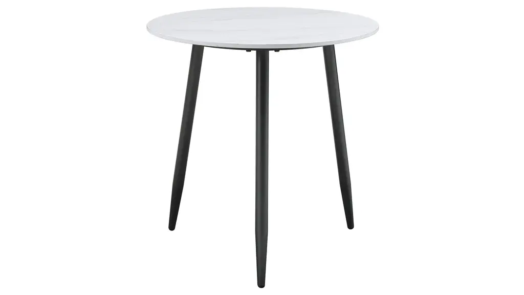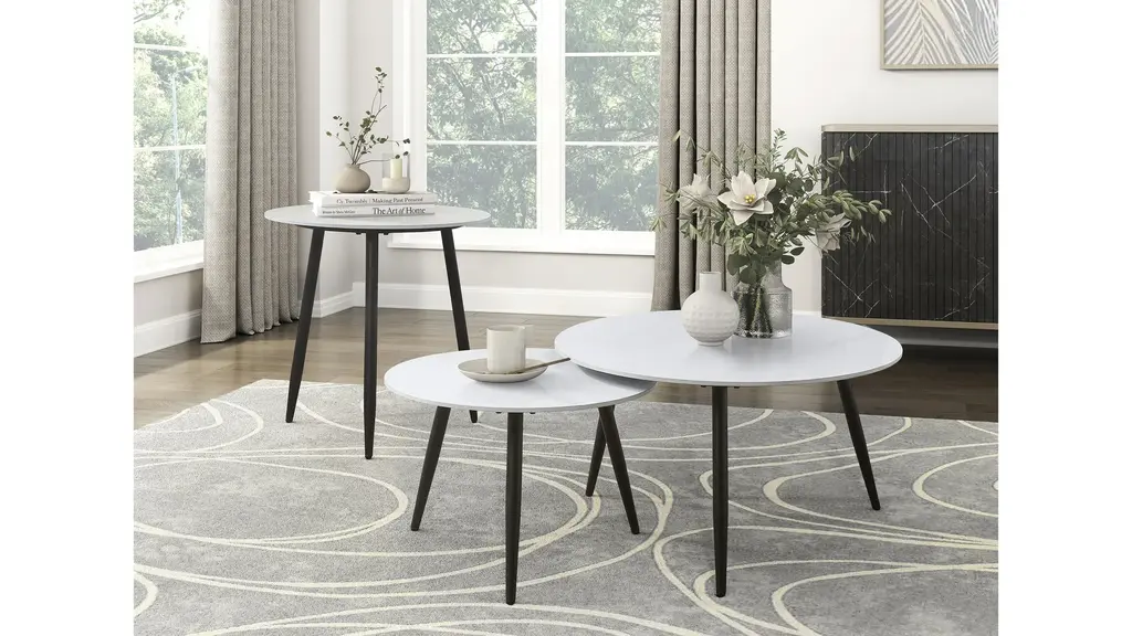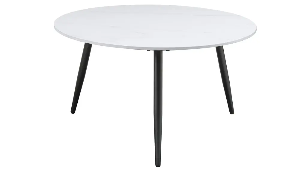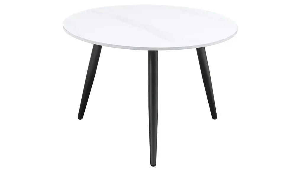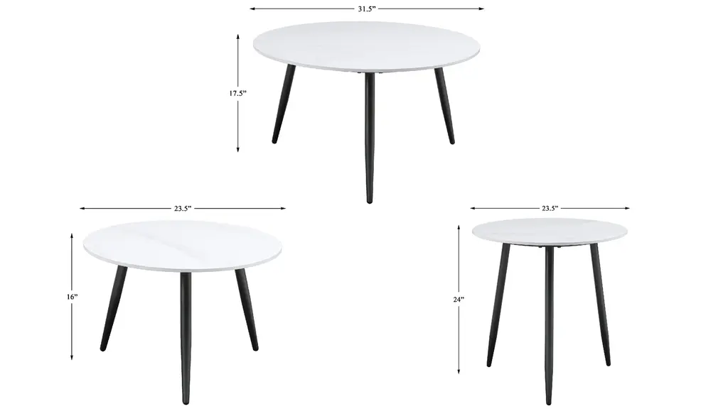 Minot 3-pc. Occasional Tables is streamlined profile pairs three occasional tables for a cohesive presentation. Conveniently packaged together, the nesting round cocktail tables and round end table feature white marble-inspired sintered stone tops and black finished metal legs.