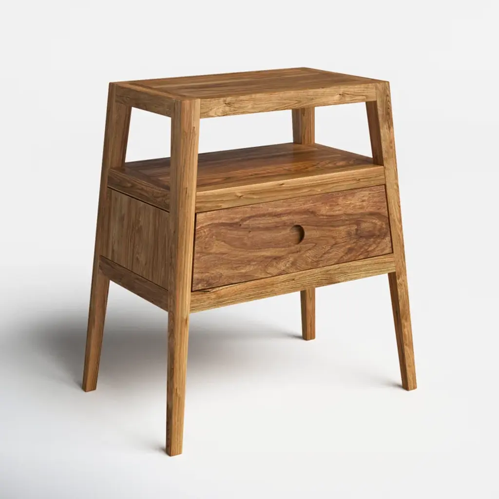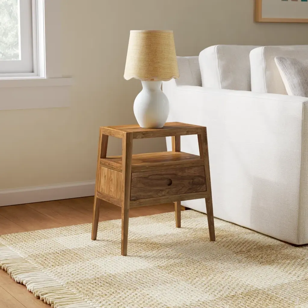 The shapely, tapered design of the Minsk end table will impress your guests. The shelf surfaces offer display space while the drawer with a unique cutaway pull gives you a place to tuck away your needs.