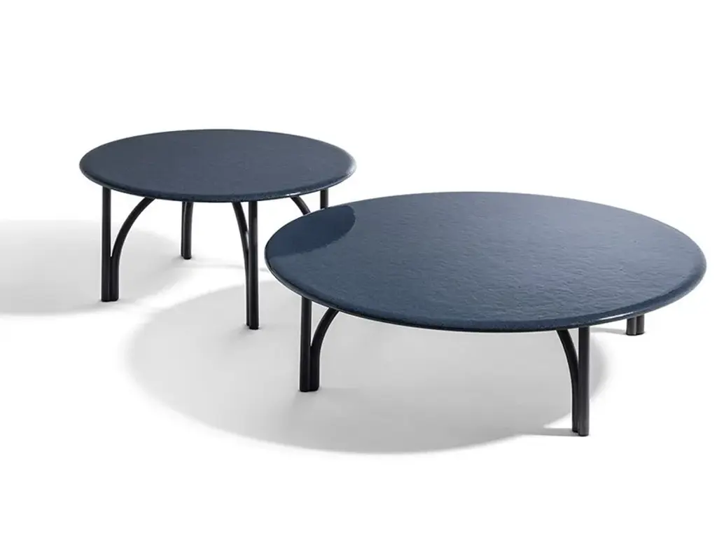 Mirabell outdoor round occasional tables are available in various sizes. The frame is made of powder-coated aluminum with an embossed finish. The top is available either in aluminum like the frame or enameled lava stone in various colors.The Mirabell collection draws inspiration from the timeless elegance of 20th-century French metal benches and seats. Painted wrought iron furniture that graced parks or elegant private gardens. GamFratesi reinterprets this decorative spirit with a contemporary, more essential and rigorous language. The seats and other elements of the collection are supported by a metal frame raised off the ground with a double foot. Taking cues from rattan furniture typically used in outdoor furniture, the structure incorporates a series of woven metal elements, creating the illusion of a large suspended basket ready to accommodate plush upholstered cushions or small table tops. This element, with its distinctive supporting curve, serves as the hallmark of the entire outdoor collection.