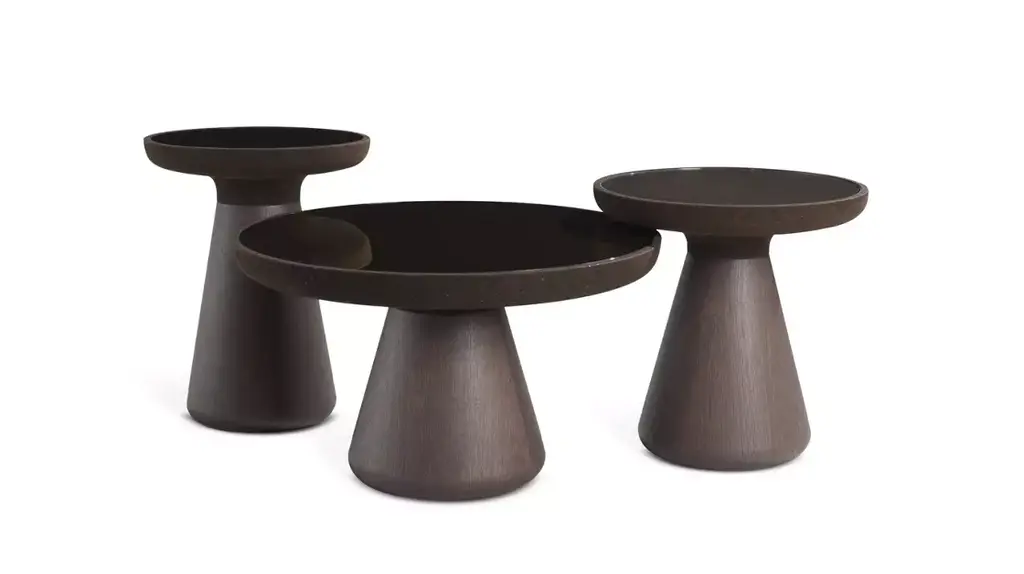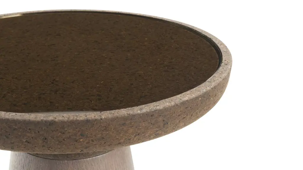 Base in 3D oak veneer or lacquer finish on MDF Brown or natural cork top Top insert in tempered bronze glass, extra-clear glass or lacquered glass