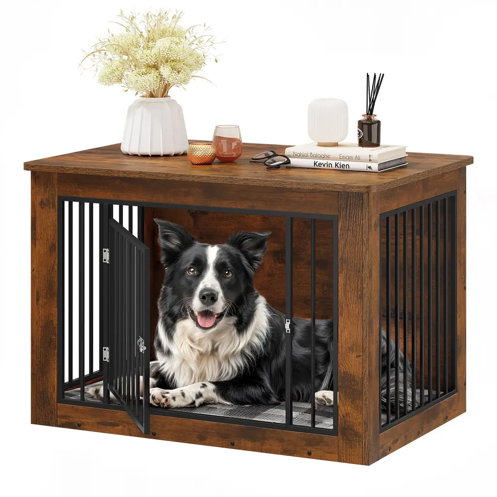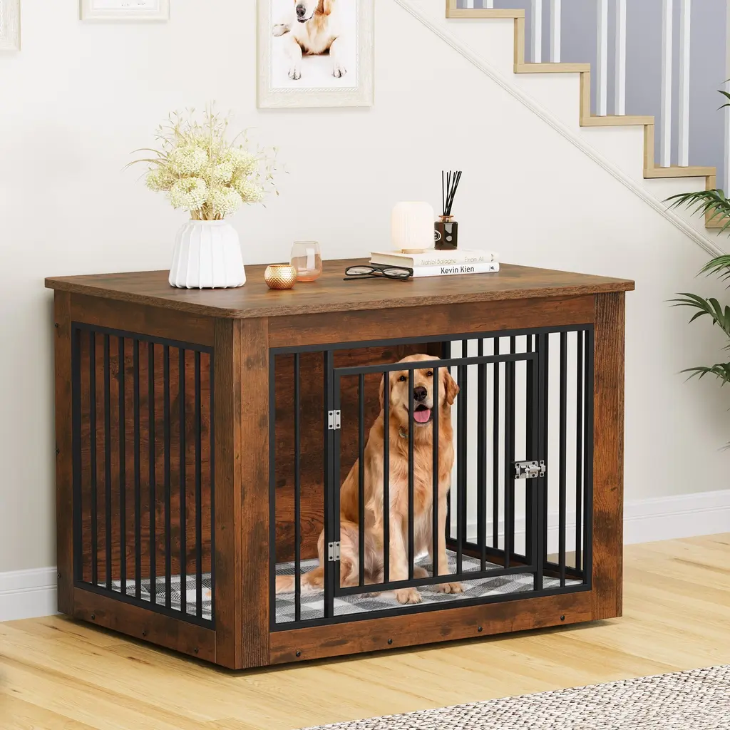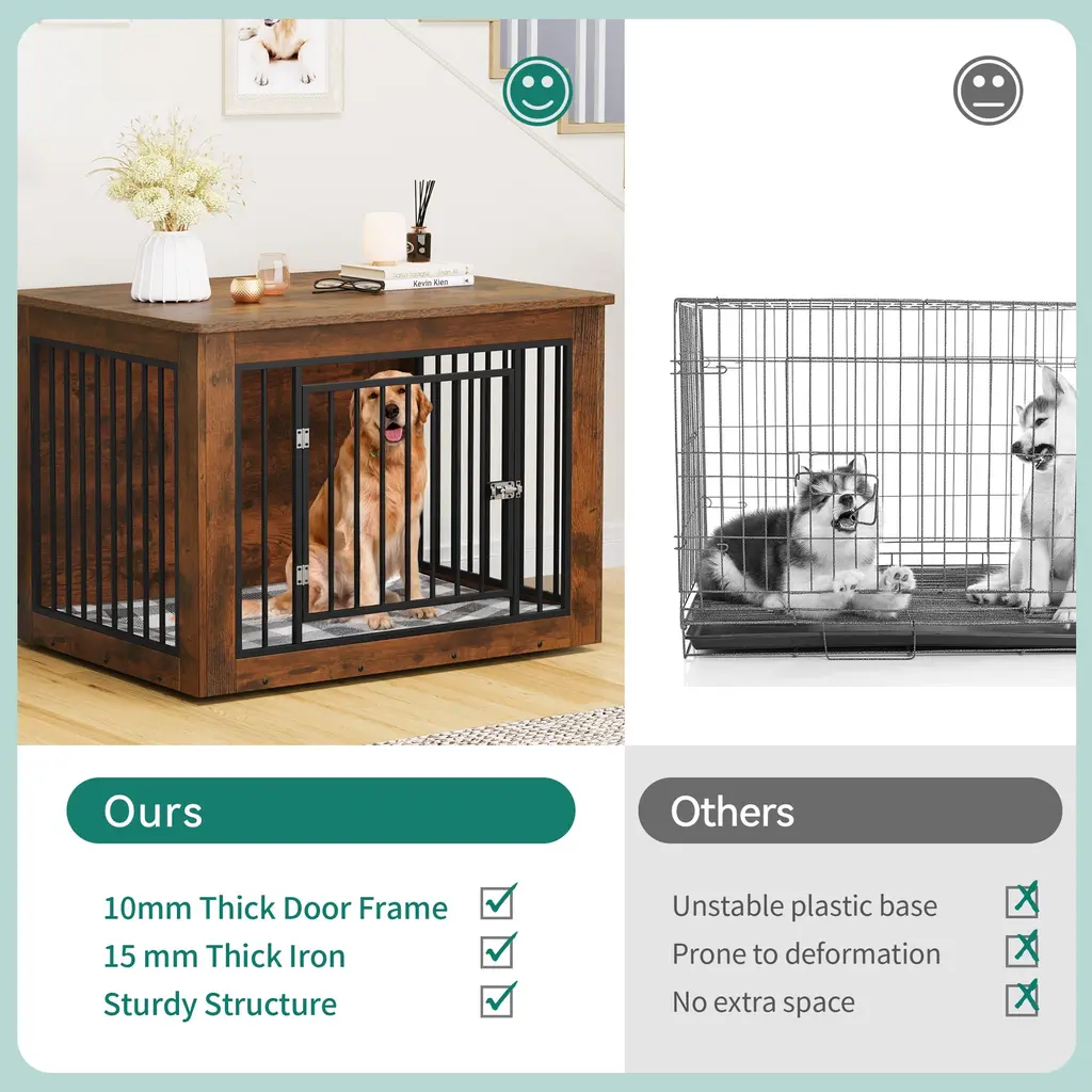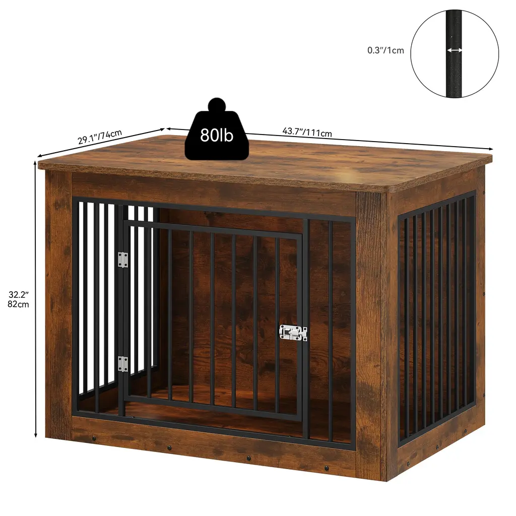 Ensure your furry friend's comfort and safety with our premium dog crate, crafted from CARB Phase II certified MDF. This ensures harmful substances are strictly controlled during production, offering a safe environment for both you and your dog. The 15mm thick wood panels and sturdy metal tubes, coated with durable powder spray, guarantee long-lasting durability. Its versatile height allows it to function as a stylish side table, seamlessly blending with your home decor. The surface features high-quality veneer, providing a beautiful texture that's easy to clean with just a damp cloth. Additionally, the rounded edges on the tabletop prevent any injuries to your dog while they play and run around.Feature Safety First: Made from CARB Phase II certified MDF, strictly controlling harmful substances for your peace of mind. Versatile Use: Ideal height for dual functionality as a stylish side table, complementing your home decor. Durable Design: Constructed with 15mm thick wood panels and sturdy powder-coated metal tubes for exceptional durability. Rounded Edges: Designed with rounded edges to prevent injury to your dog while they run and play. Beautiful Finish: High-quality veneer surface offers a gorgeous texture that fits seamlessly into any home setting. Dimensions Medium (26.8"H x 38.2"W x 24"D) Large (32.2"H x 43.7"W x 29.1"D) Small (25"H x 30"W x 21"D)