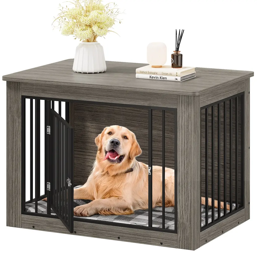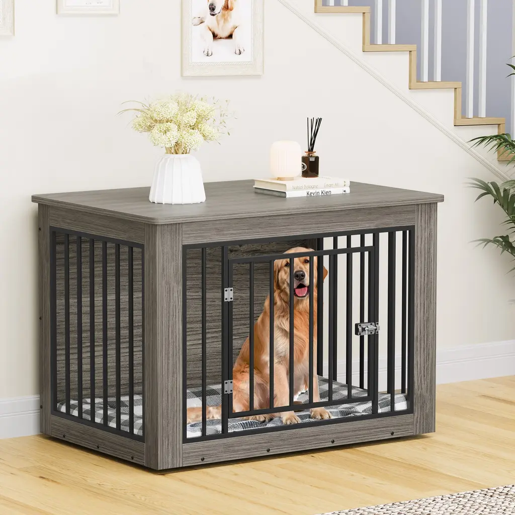 Ensure your furry friend's comfort and safety with our premium dog crate, crafted from CARB Phase II certified MDF. This ensures harmful substances are strictly controlled during production, offering a safe environment for both you and your dog. The 15mm thick wood panels and sturdy metal tubes, coated with durable powder spray, guarantee long-lasting durability. Its versatile height allows it to function as a stylish side table, seamlessly blending with your home decor. The surface features high-quality veneer, providing a beautiful texture that's easy to clean with just a damp cloth. Additionally, the rounded edges on the tabletop prevent any injuries to your dog while they play and run around.Feature Safety First: Made from CARB Phase II certified MDF, strictly controlling harmful substances for your peace of mind. Versatile Use: Ideal height for dual functionality as a stylish side table, complementing your home decor. Durable Design: Constructed with 15mm thick wood panels and sturdy powder-coated metal tubes for exceptional durability. Rounded Edges: Designed with rounded edges to prevent injury to your dog while they run and play. Beautiful Finish: High-quality veneer surface offers a gorgeous texture that fits seamlessly into any home setting. Dimensions Medium (26.8"H x 38.2"W x 24"D) Large (32.2"H x 43.7"W x 29.1"D) Small (25"H x 30"W x 21"D)