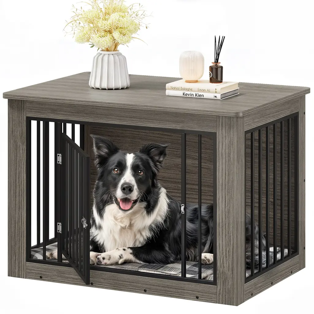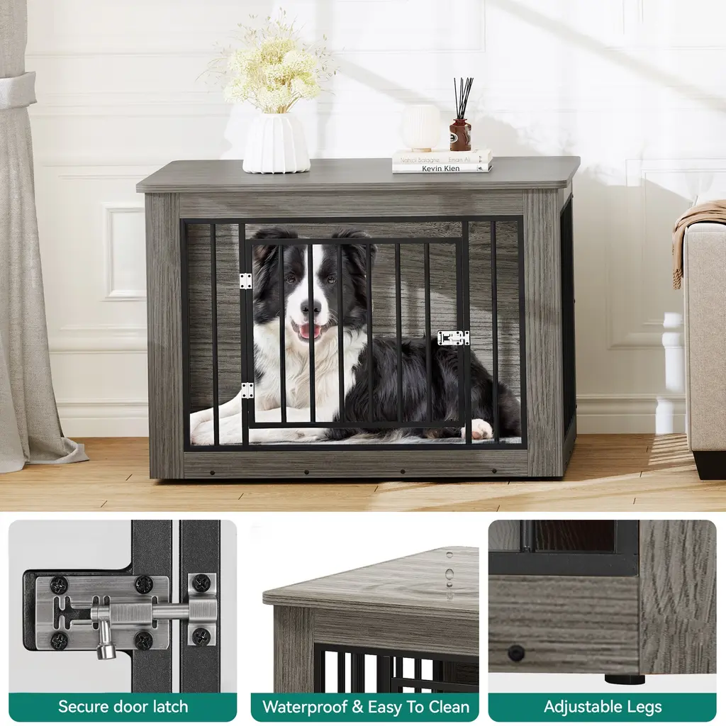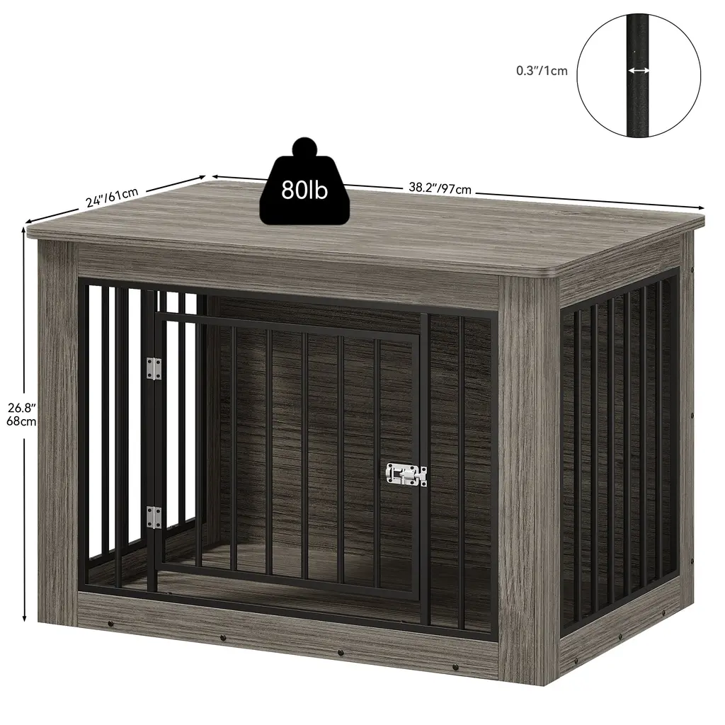 Ensure your furry friend's comfort and safety with our premium dog crate, crafted from CARB Phase II certified MDF. This ensures harmful substances are strictly controlled during production, offering a safe environment for both you and your dog. The 15mm thick wood panels and sturdy metal tubes, coated with durable powder spray, guarantee long-lasting durability. Its versatile height allows it to function as a stylish side table, seamlessly blending with your home decor. The surface features high-quality veneer, providing a beautiful texture that's easy to clean with just a damp cloth. Additionally, the rounded edges on the tabletop prevent any injuries to your dog while they play and run around.Feature Safety First: Made from CARB Phase II certified MDF, strictly controlling harmful substances for your peace of mind. Versatile Use: Ideal height for dual functionality as a stylish side table, complementing your home decor. Durable Design: Constructed with 15mm thick wood panels and sturdy powder-coated metal tubes for exceptional durability. Rounded Edges: Designed with rounded edges to prevent injury to your dog while they run and play. Beautiful Finish: High-quality veneer surface offers a gorgeous texture that fits seamlessly into any home setting. Dimensions Medium (26.8"H x 38.2"W x 24"D) Large (32.2"H x 43.7"W x 29.1"D) Small (25"H x 30"W x 21"D)