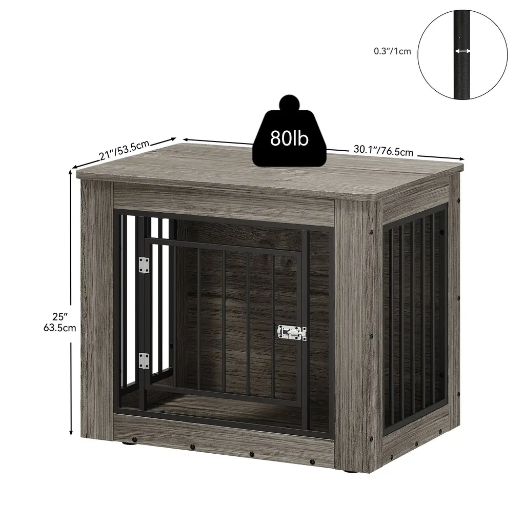 Ensure your furry friend's comfort and safety with our premium dog crate, crafted from CARB Phase II certified MDF. This ensures harmful substances are strictly controlled during production, offering a safe environment for both you and your dog. The 15mm thick wood panels and sturdy metal tubes, coated with durable powder spray, guarantee long-lasting durability. Its versatile height allows it to function as a stylish side table, seamlessly blending with your home decor. The surface features high-quality veneer, providing a beautiful texture that's easy to clean with just a damp cloth. Additionally, the rounded edges on the tabletop prevent any injuries to your dog while they play and run around.Feature Safety First: Made from CARB Phase II certified MDF, strictly controlling harmful substances for your peace of mind. Versatile Use: Ideal height for dual functionality as a stylish side table, complementing your home decor. Durable Design: Constructed with 15mm thick wood panels and sturdy powder-coated metal tubes for exceptional durability. Rounded Edges: Designed with rounded edges to prevent injury to your dog while they run and play. Beautiful Finish: High-quality veneer surface offers a gorgeous texture that fits seamlessly into any home setting. Dimensions Medium (26.8"H x 38.2"W x 24"D) Large (32.2"H x 43.7"W x 29.1"D) Small (25"H x 30"W x 21"D)
