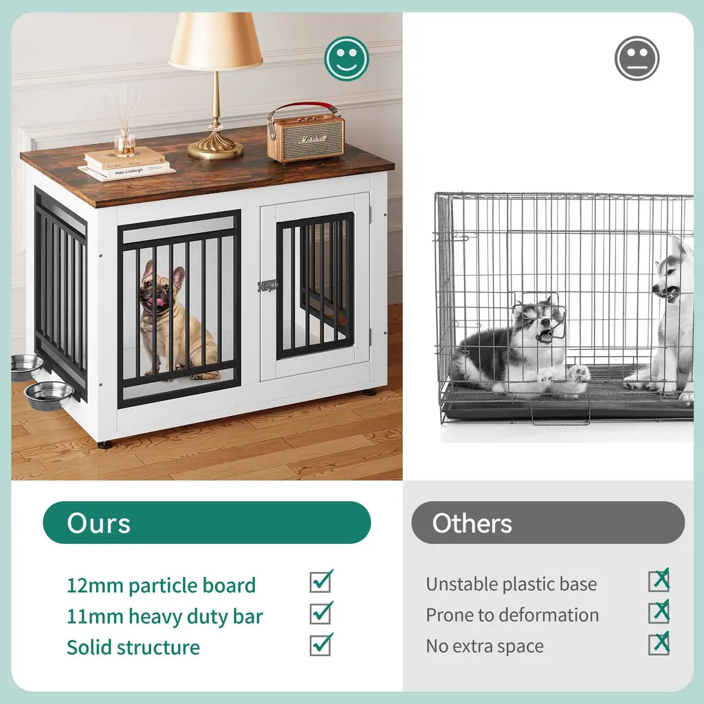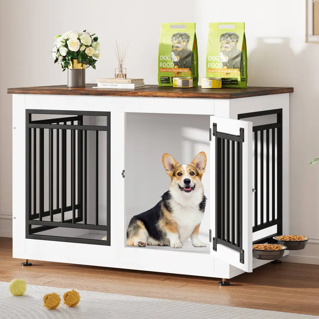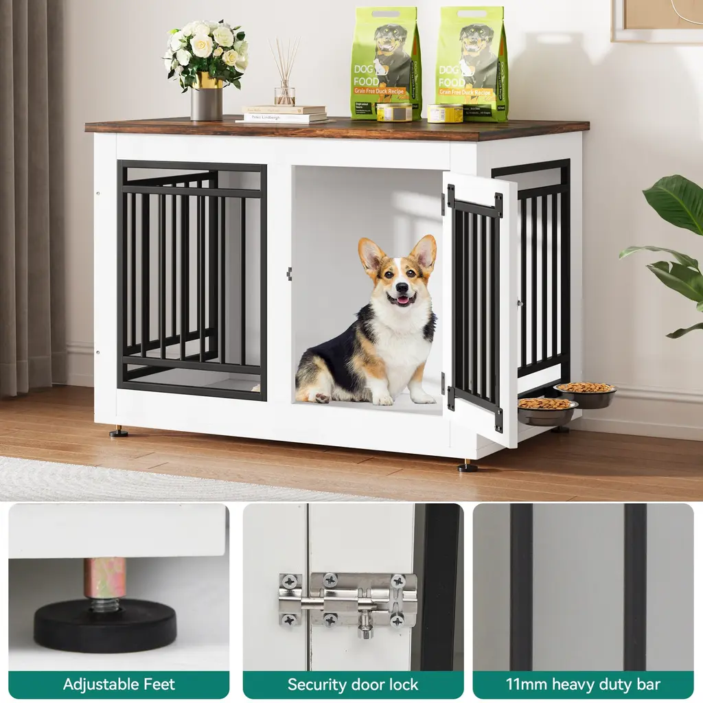 Combining style and utility, our dog crate doubles as a chic side table, blending seamlessly with your decor. Crafted from durable 12mm particle board and 11mm iron pipes, it withstands chewing and wear. The adjustable wooden top caters to your space, while the dual-size door design ensures your pet's comfort and security. Features