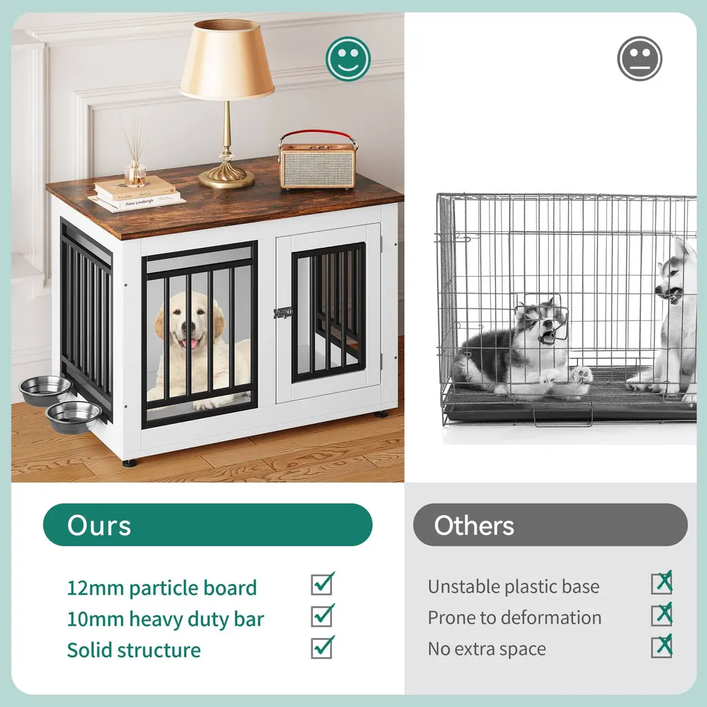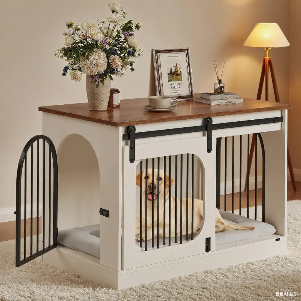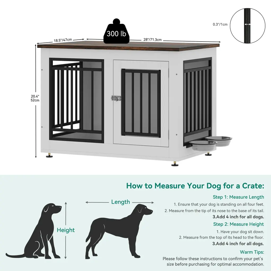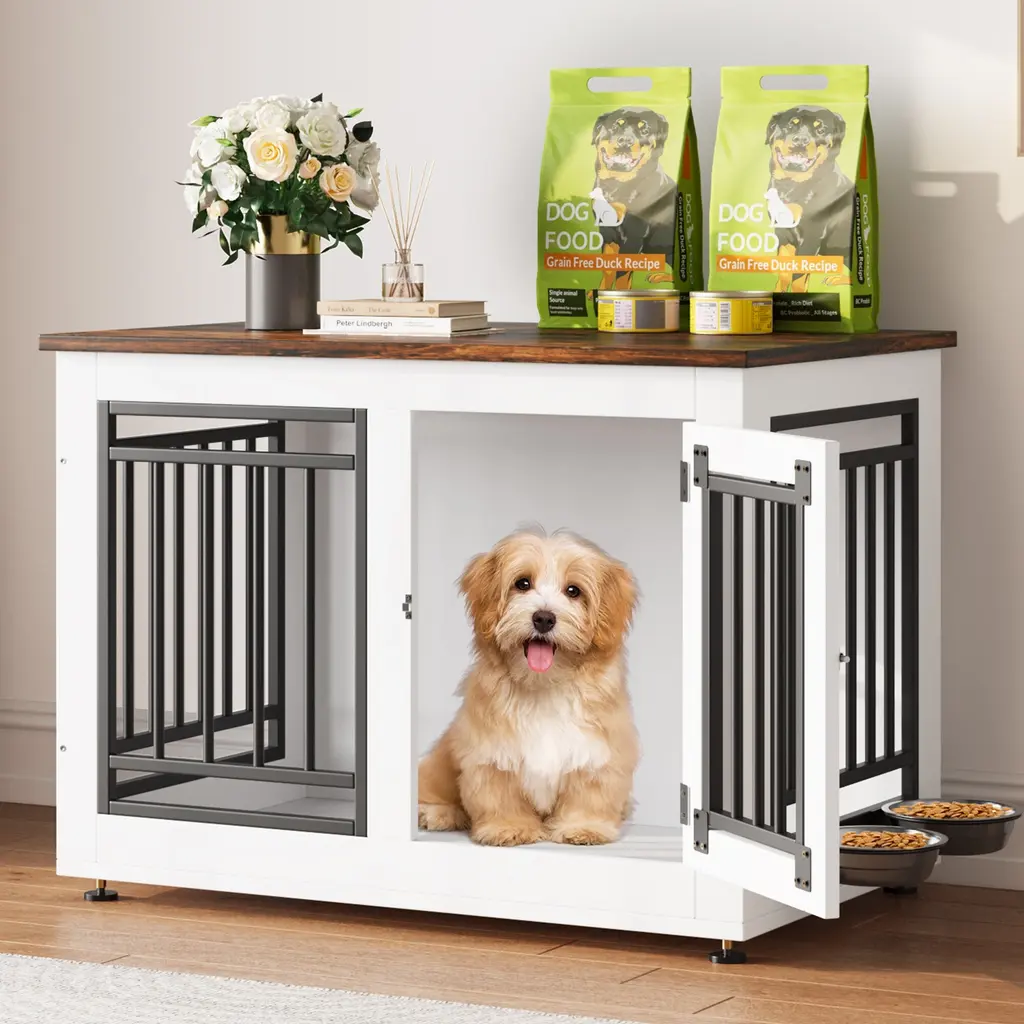 Combining style and utility, our dog crate doubles as a chic side table, blending seamlessly with your decor. Crafted from durable 12mm particle board and 11mm iron pipes, it withstands chewing and wear. The adjustable wooden top caters to your space, while the dual-size door design ensures your pet's comfort and security. Features