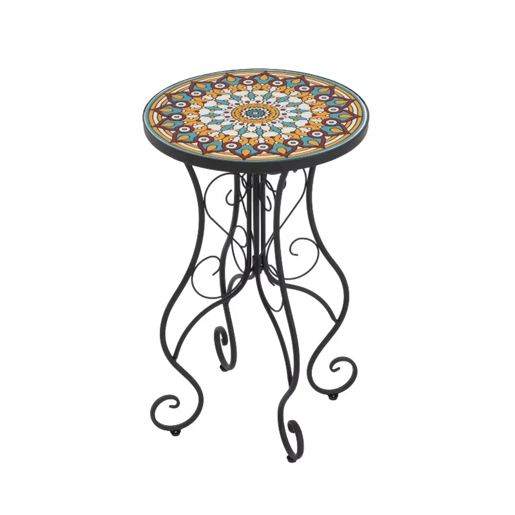 Elevate your outdoor decor with this decorative ceramic tile side table, crafted to impress with its colorful mandala mosaic tabletop. The intricate tilework adds a global-inspired touch, while the elegant scroll iron base enhances its classic appeal. Durable and weather-resistant, this table is perfect for both style and function—use it to hold a cup of coffee, display your favorite potted plant, or simply add flair to your patio or sunroom. Compact, sturdy, and rich in design, this accent table brings personality to any corner.