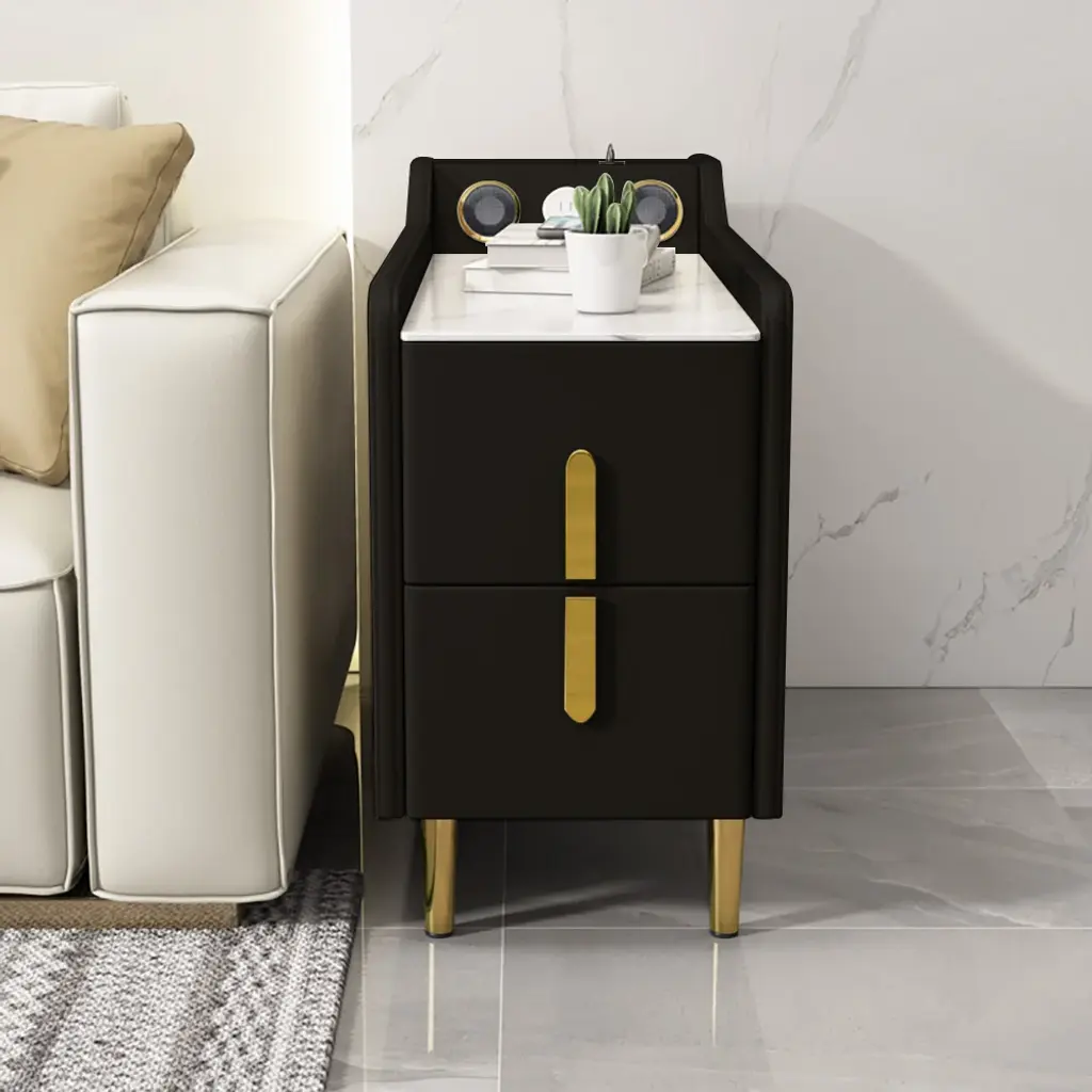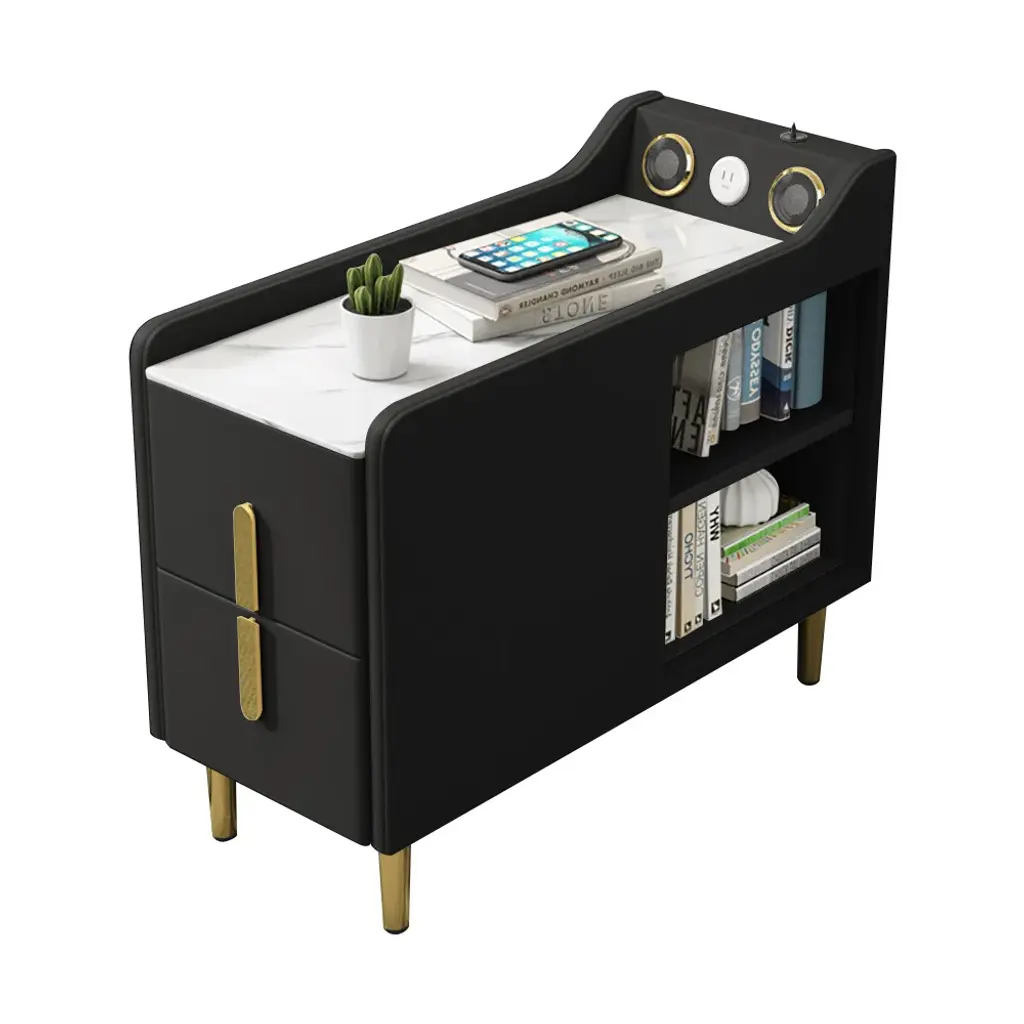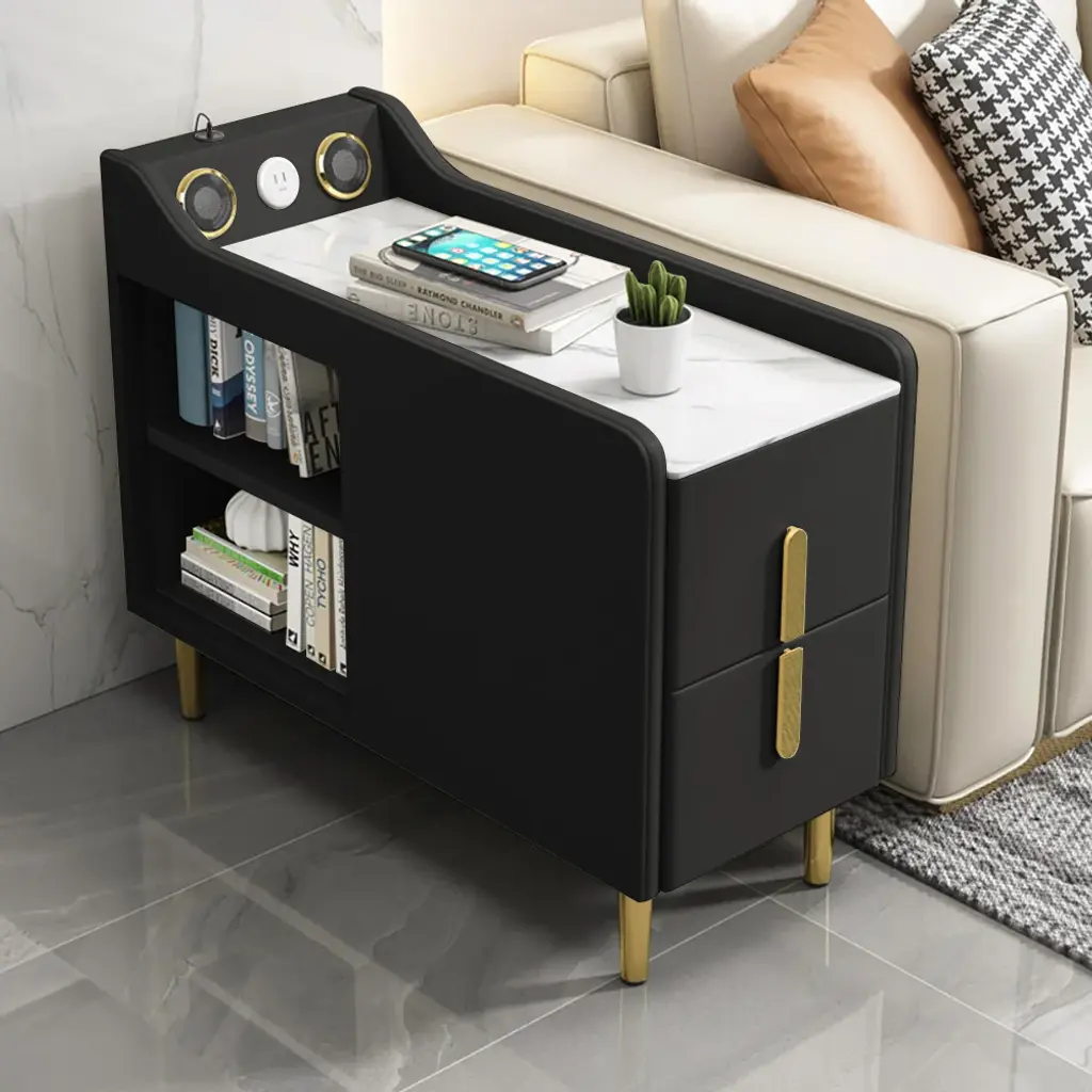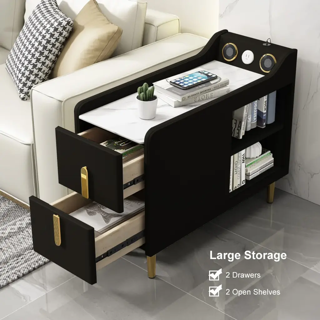 Modern Black Narrow Side Table Sintered Stone Top End Table Speaker & Usb Port