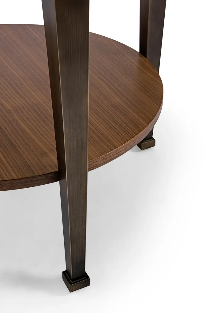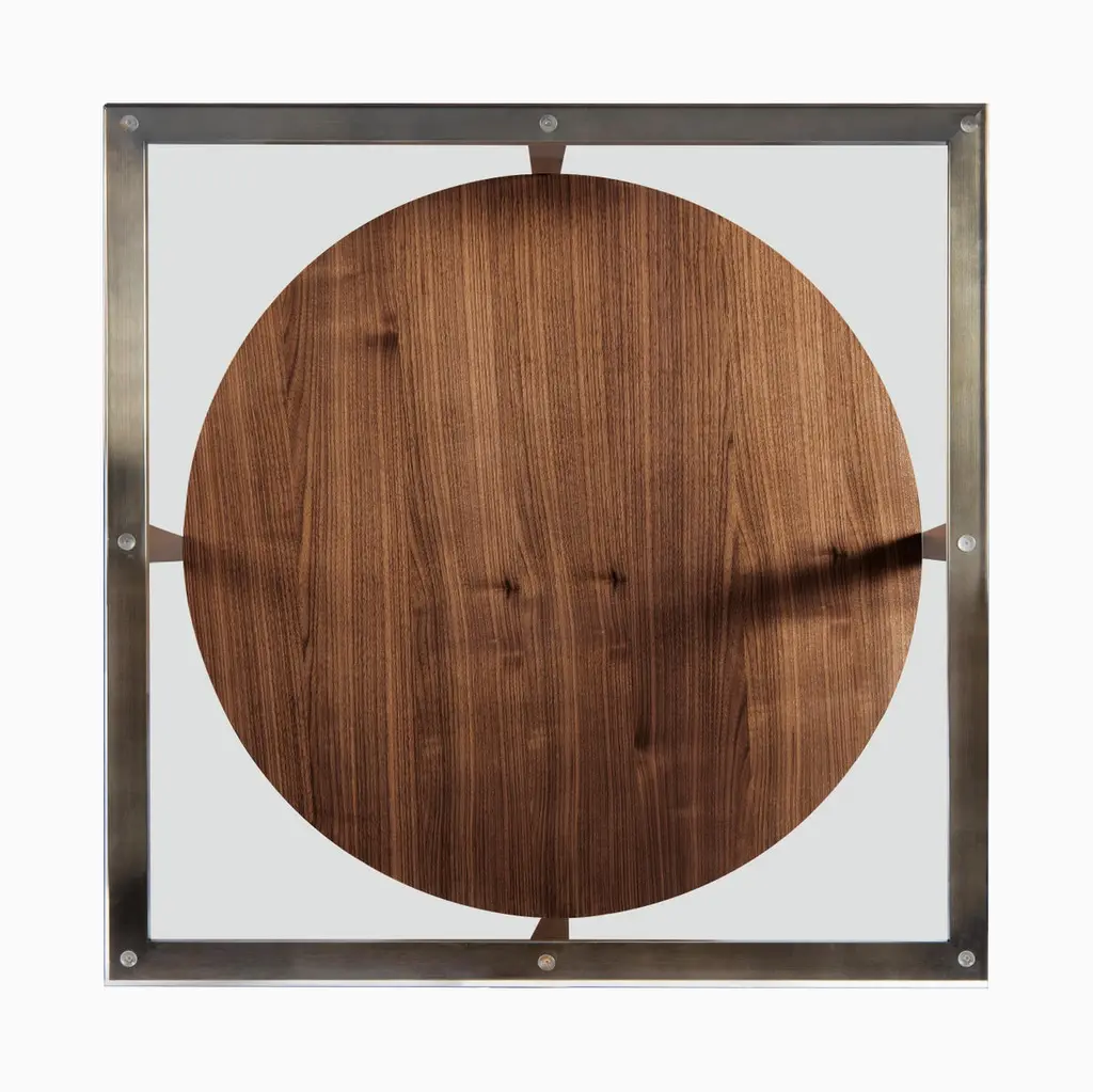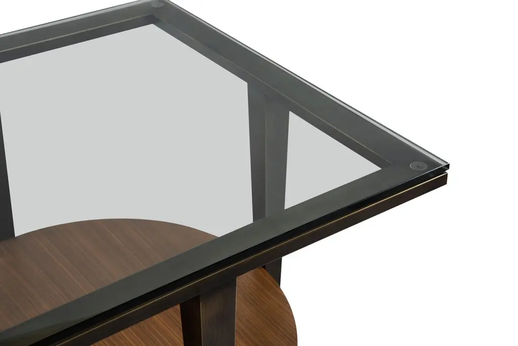 Modern Bronze and Walnut End table with Glass top designed by Greg Sheres. In Stock.The "Manhattan" lamp table is a beautiful combination of walnut, stainless steel with an antique bronze finish, and glass. The round form of the walnut shelf is set off by the square glass top. As beautiful as it is functional. The walnut shelf is useful for storing books, magazines, etc. while the top surface can be used for drinks and other items. This is an original design by award winning furniture designer Greg Sheres. Greg’s pieces are well known for their clean forms and restrained elegance. Maintenance: lightly dust or clean the walnut with a damp soft cloth. Clean the glass with any glass cleaner. The bronze frame and legs can be cleaned with non-abrasive car polish.