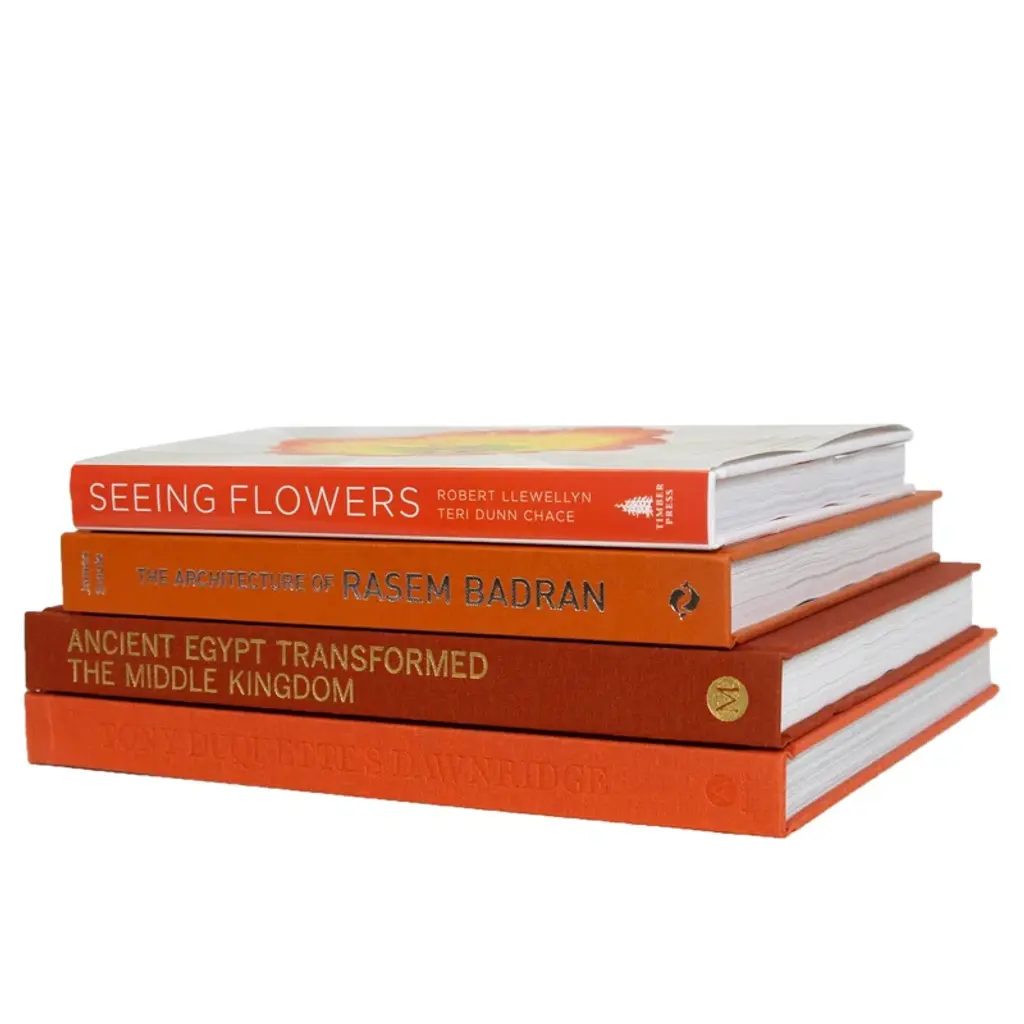 This product features a blend of four authentic hardback books published 1990-present all displayed in a handsome pyramidal stack. A treasure for any room, the set includes art-themed content in rich shades of warm orange and mustard yellow with some dust-jacketed covers. Enhance a coffee table, side table, or bookshelf with these decorative new books. Titles may differ slightly from those pictured but color patterns will remain the same. If ordering multiple quantities titles may be duplicated.