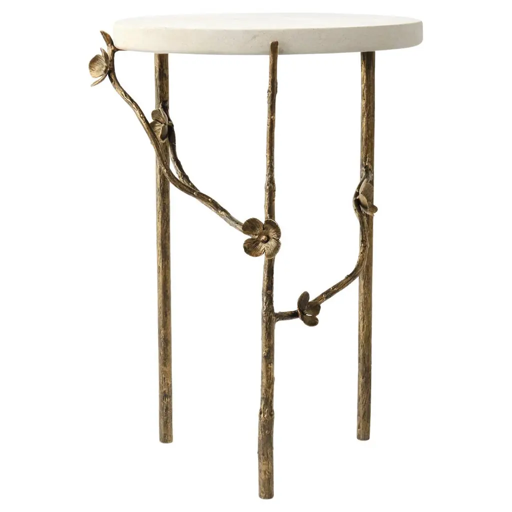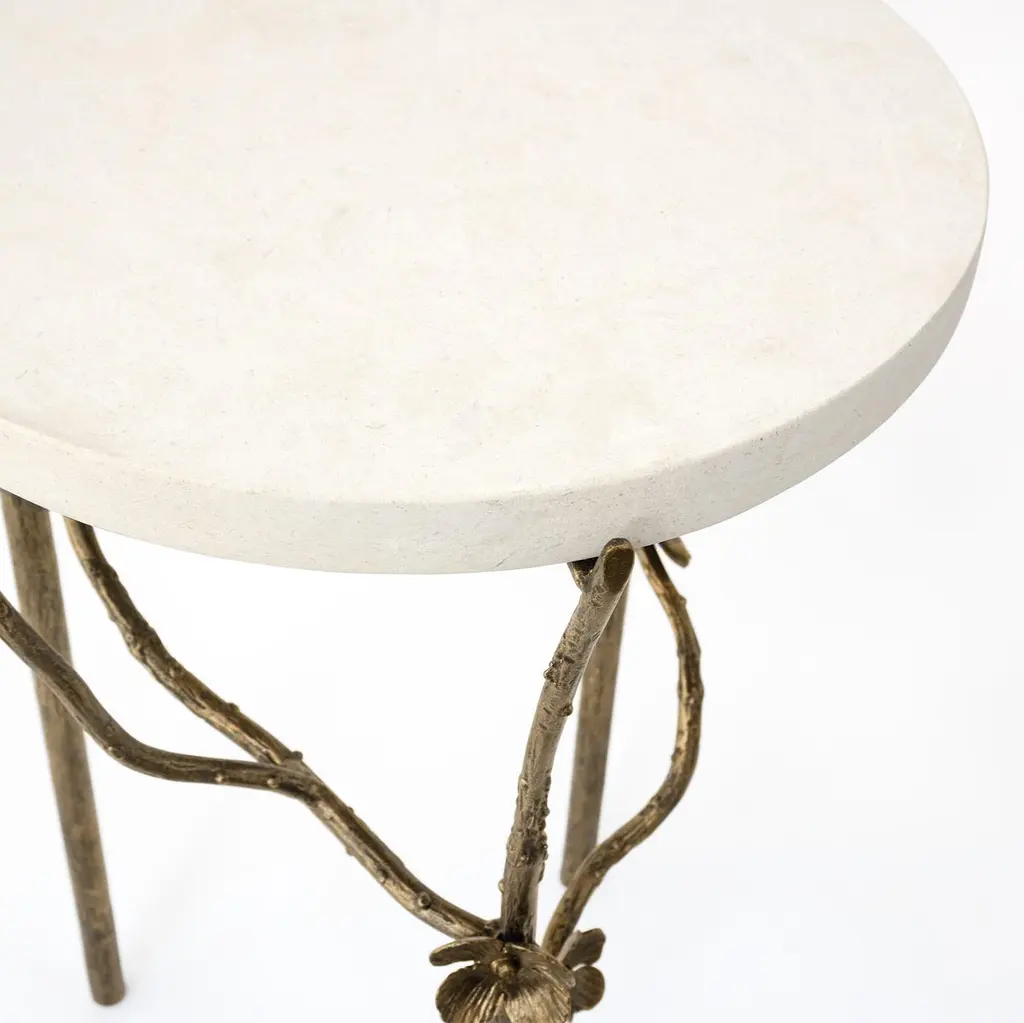 Immerse yourself in the delicate beauty of the handcrafted Modern Cherry Blossom Accent Table, where a single forged branch and a small cluster of blossoms delicately adorn this exquisite piece. This feminine touch adds an ethereal charm, making it a captivating addition to any space.Topping this table is a matte polished natural travertine stone, elevating its elegance to new heights. The dynamic base, with its intricate design inspired by nature's wonders, creates a striking contrast against the smooth and pristine surface of the stone.As you admire this mesmerizing piece, its impeccable craftsmanship becomes evident. Each handcrafted detail showcases the skill and passion of the artisans who created it, resulting in a timeless piece of functional art.Elevate your living space with the Modern Cherry Blossom Accent Table and immerse yourself in its beauty, where artistry and nature converge in perfect harmony.
