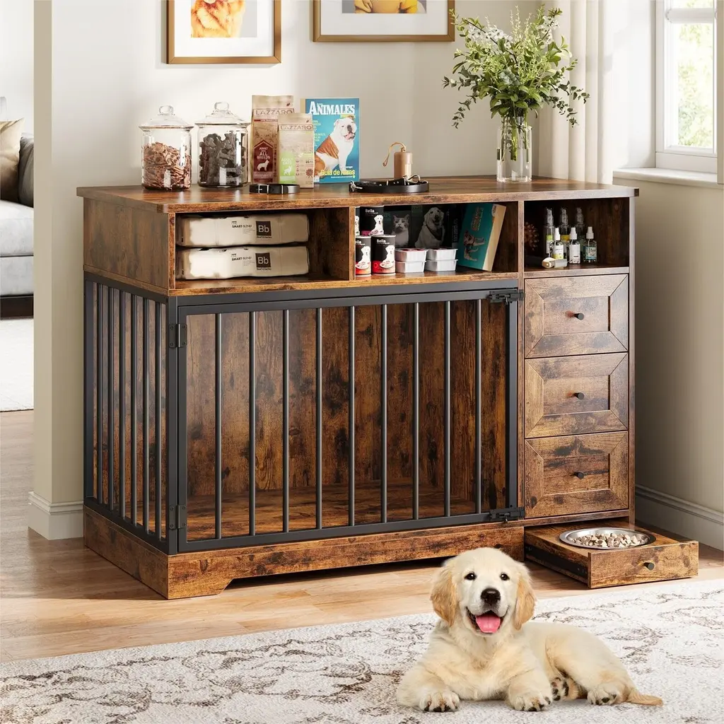 The cushioned interior provides superior comfort with a machine-washable cover, while the pull-out drawer with a divider helps you stay organized. Built with tough steel wires and a solid particle board bottom, this crate ensures safety and durability for dogs up to 44 lbs.Features:Product Dimensions: